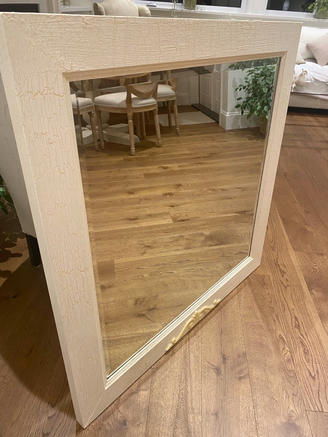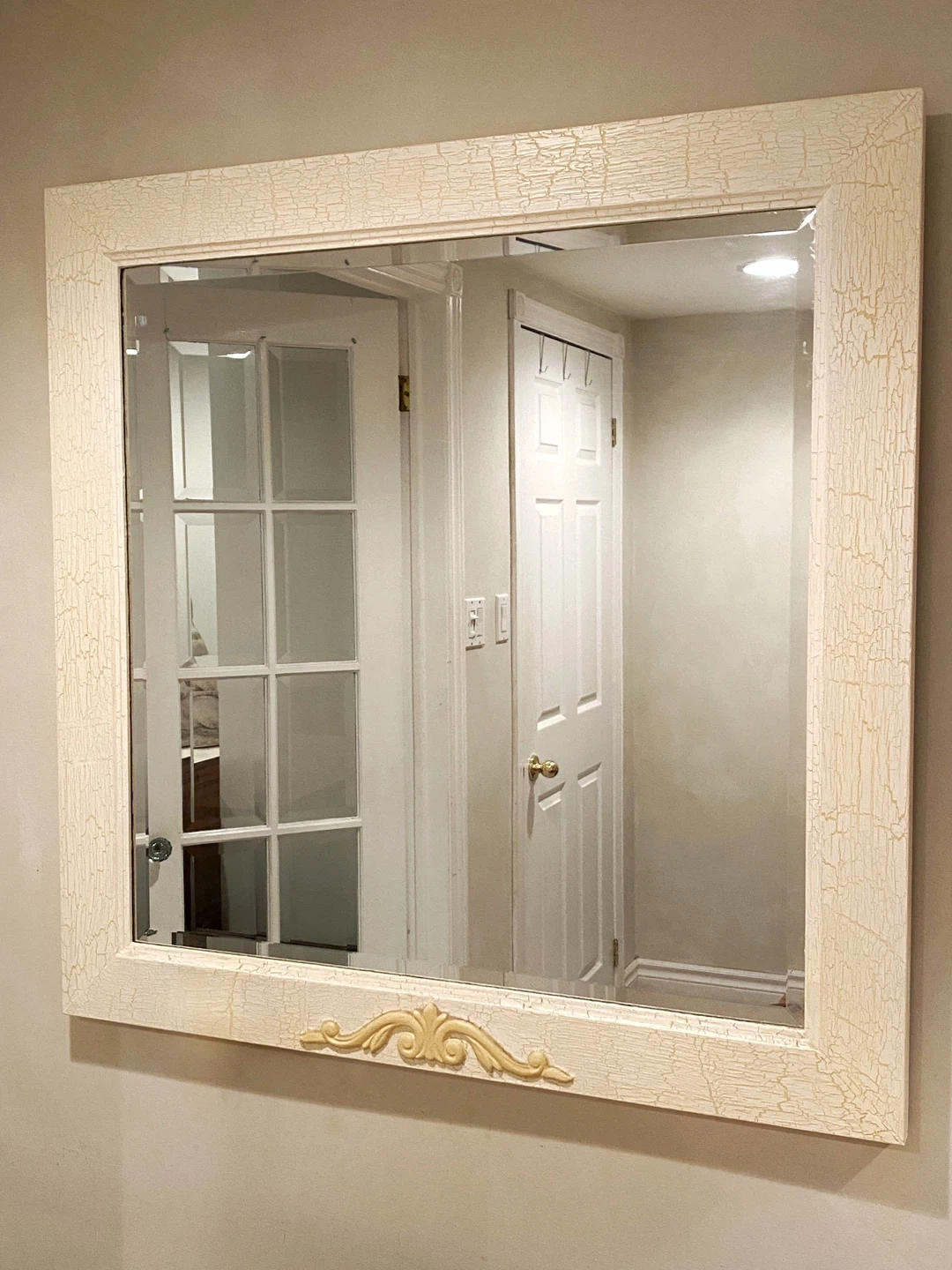 GORGEOUS Very Large beveled mirror designer painted /antiqued in a crackle finish in a beautiful cream and soft yellow.