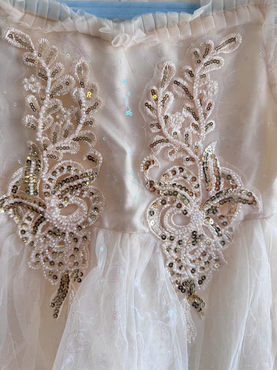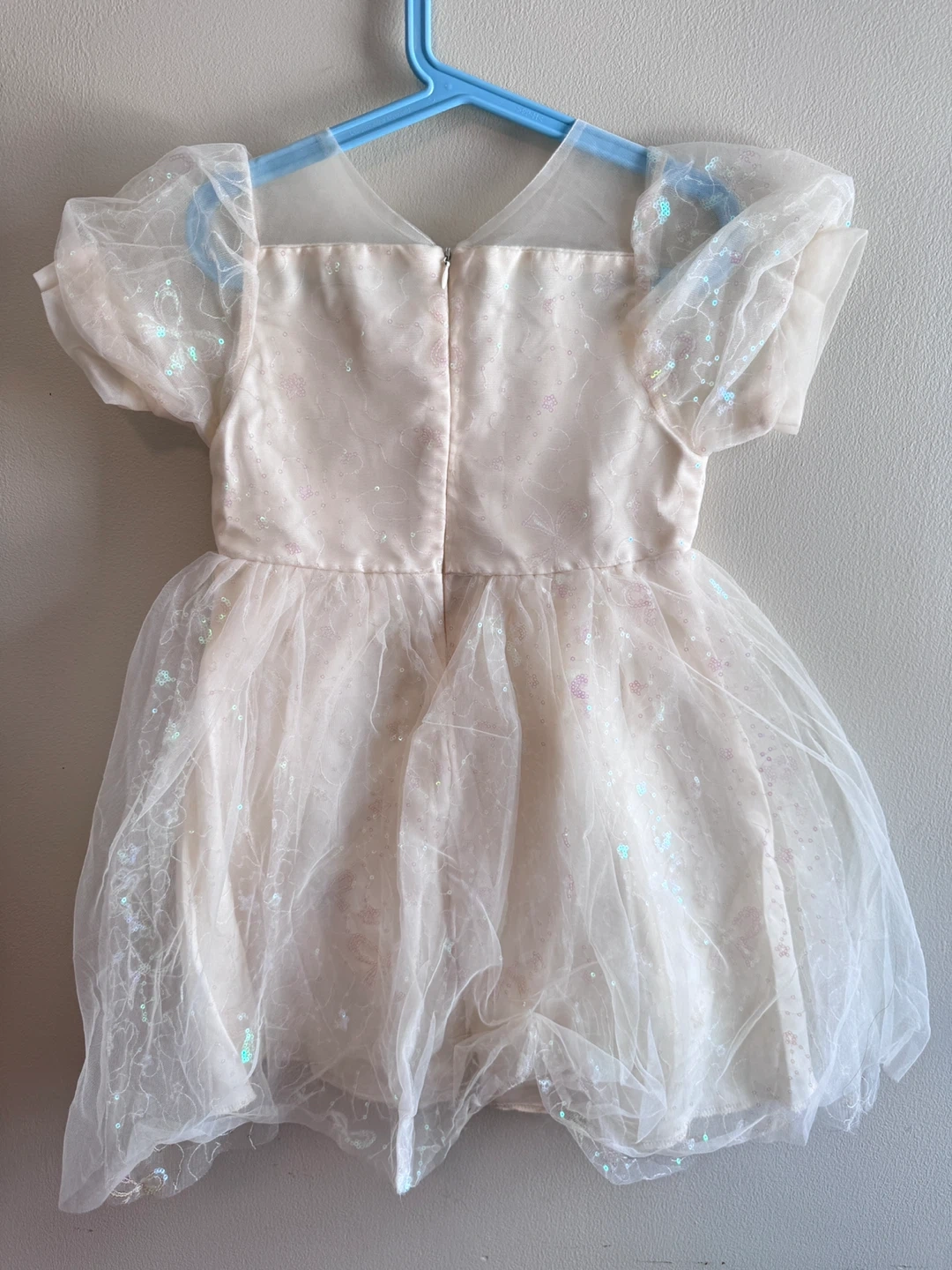 Beautiful sparkly tulle dress with intricate sequin and beadwork on the front bodice. It features a sheer overlay with scattered iridescent sequins and puff sleeves. This dress is perfect for special occasions or dress-up!