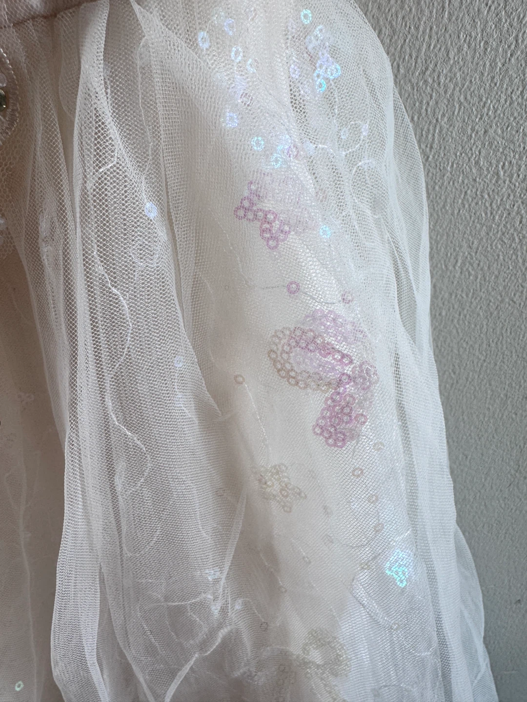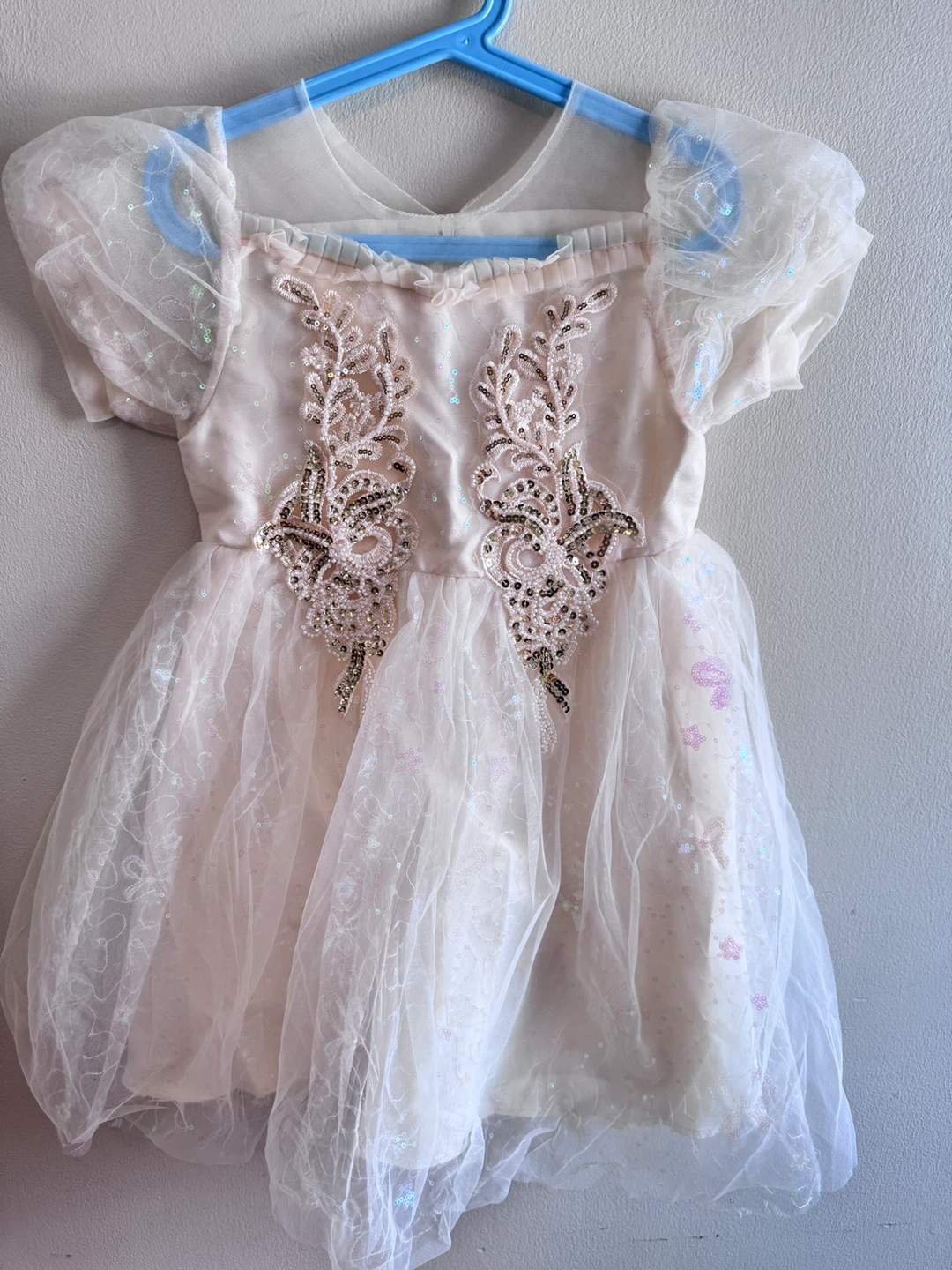 Beautiful sparkly tulle dress with intricate sequin and beadwork on the front bodice. It features a sheer overlay with scattered iridescent sequins and puff sleeves. This dress is perfect for special occasions or dress-up!