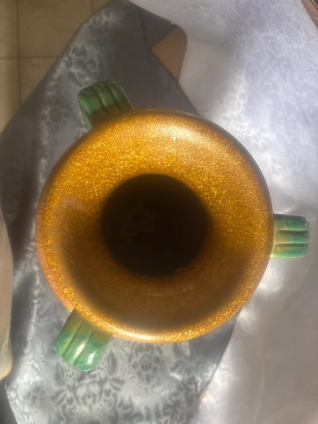 This ceramic vase features a unique drip glaze design in orange and green. It has two handles and a wide opening. It's a decorative piece for your home!