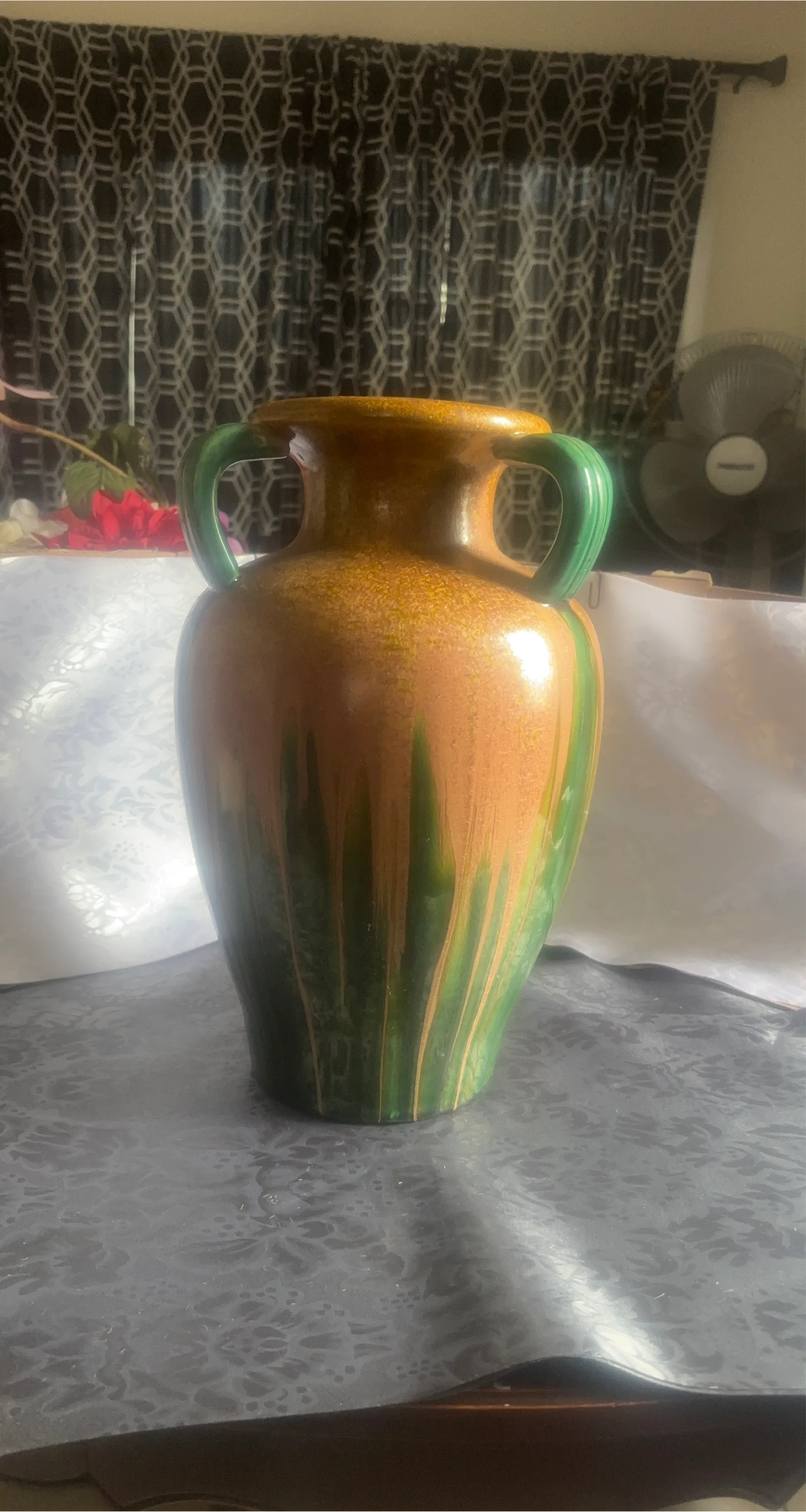 This ceramic vase features a unique drip glaze design in orange and green. It has two handles and a wide opening. It's a decorative piece for your home!