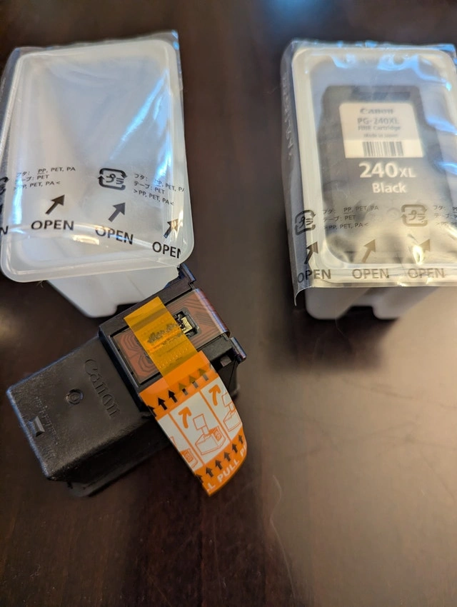 Genuine Canon ink cartridges, one jumbo black (PG-240XL) and one jumbo colour (CL-241XL). The colour ink cartridge got opened before anyone realized these were the wrong size for our printer, but the protective tape did not get removed (see photos). So both of these are brand new never used and a great deal for ink! These retail at around $60 together or $40 each, so we're asking $50 for the pair. Pickup just about anytime in the St Boniface area, cash or e-transfer only please.