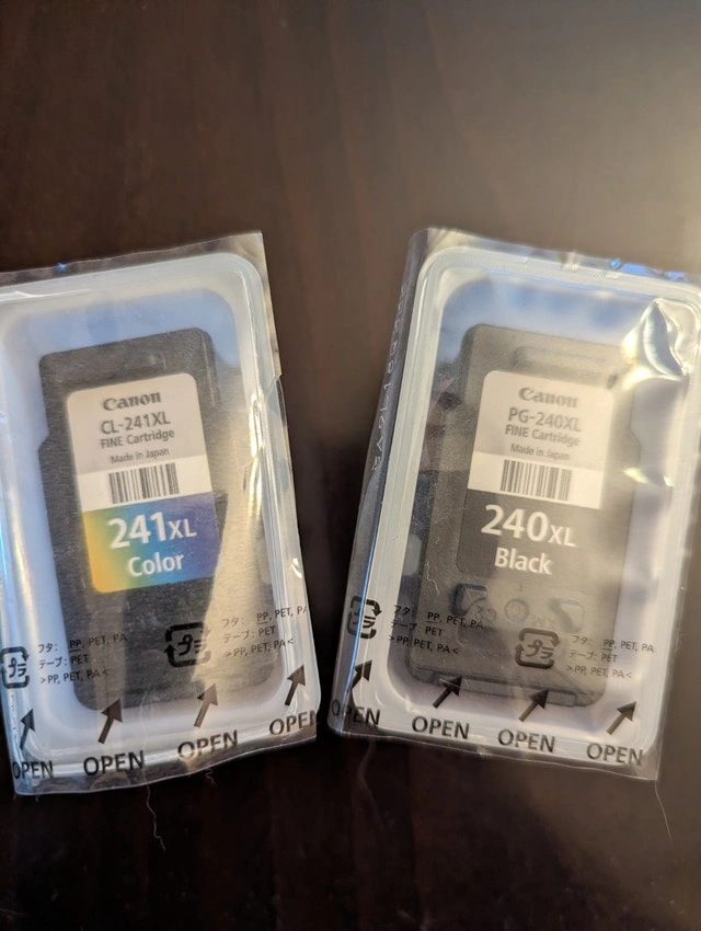 Genuine Canon ink cartridges, one jumbo black (PG-240XL) and one jumbo colour (CL-241XL). The colour ink cartridge got opened before anyone realized these were the wrong size for our printer, but the protective tape did not get removed (see photos). So both of these are brand new never used and a great deal for ink! These retail at around $60 together or $40 each, so we're asking $50 for the pair. Pickup just about anytime in the St Boniface area, cash or e-transfer only please.