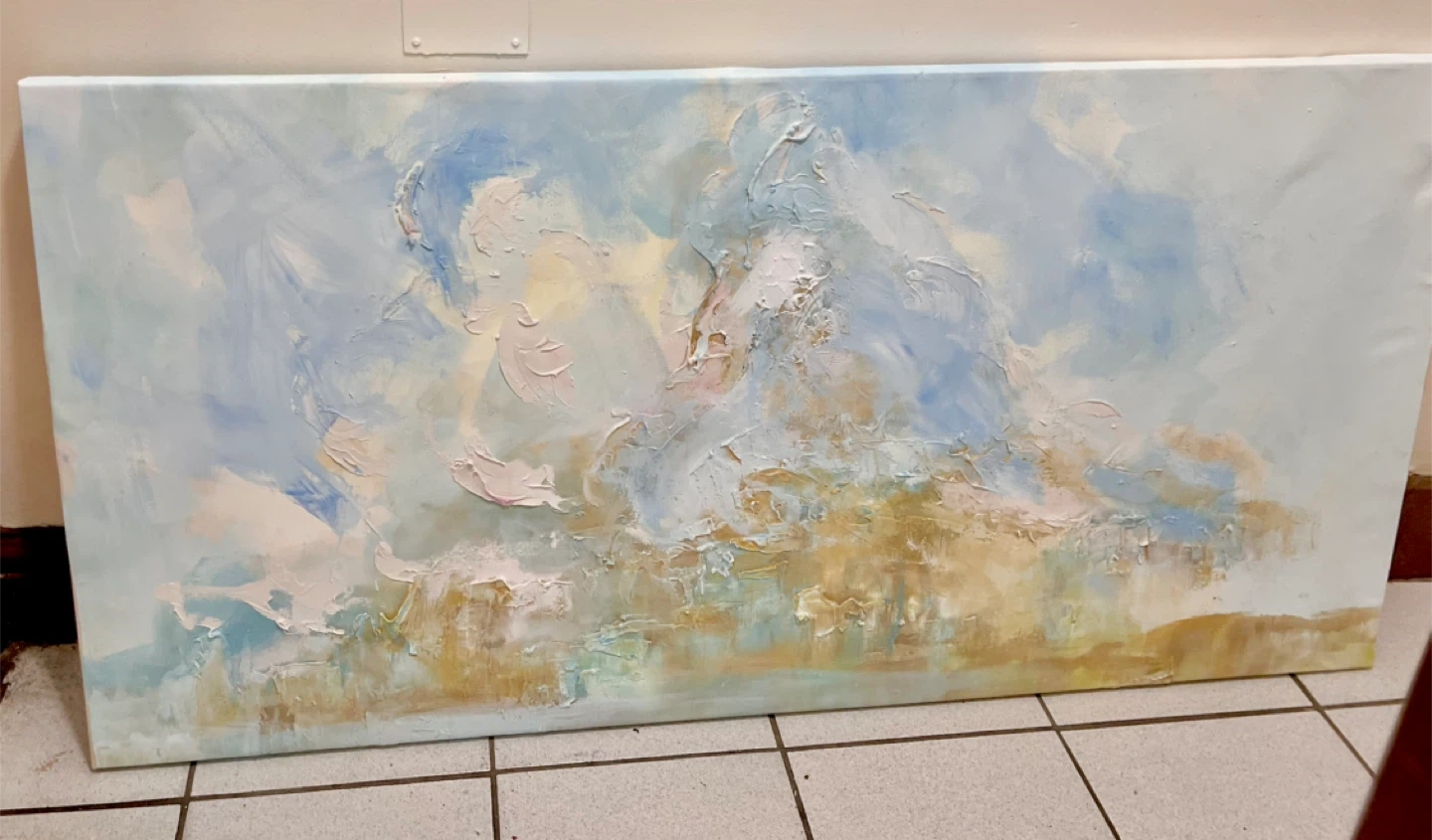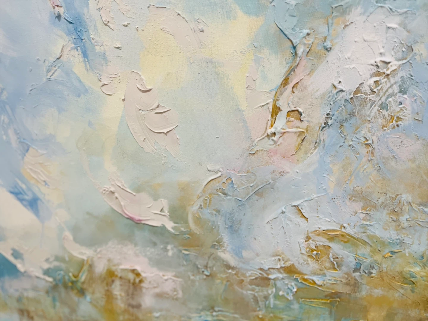 This is a textured abstract landscape painting on canvas. It is an original not a print. It features soft blues, yellows, and white with hints of pink and hints of gold. The impasto technique creates a lot of depth and visual interest. It's a statement piece for any room!