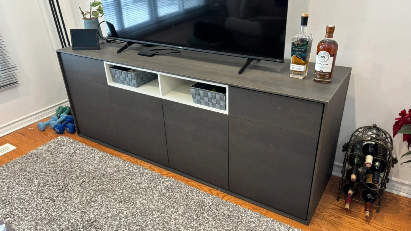 Dark wood (Grey) TV stand featuring multiple storage compartments. It includes two cabinets with doors and two drawers, along with open shelving areas.