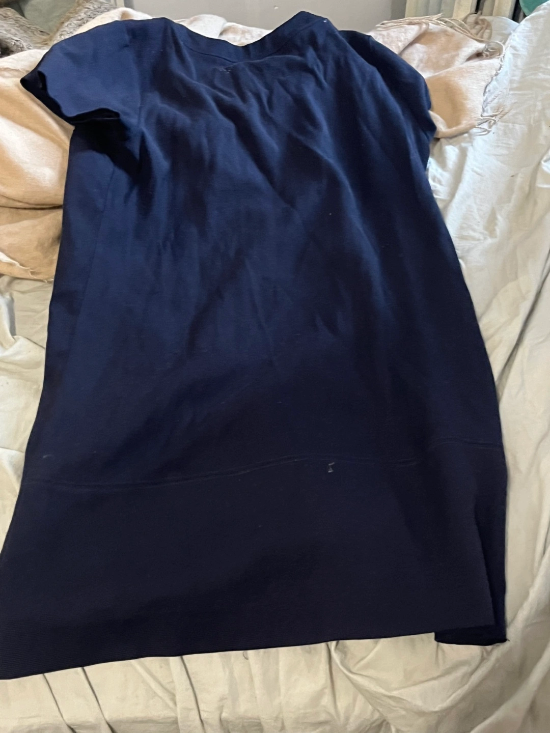 A simple navy blue dress, perfect for casual wear or dressing up with accessories! It has short sleeves and a comfortable fit. The material feels lightweight and breathable, making it great for warmer weather