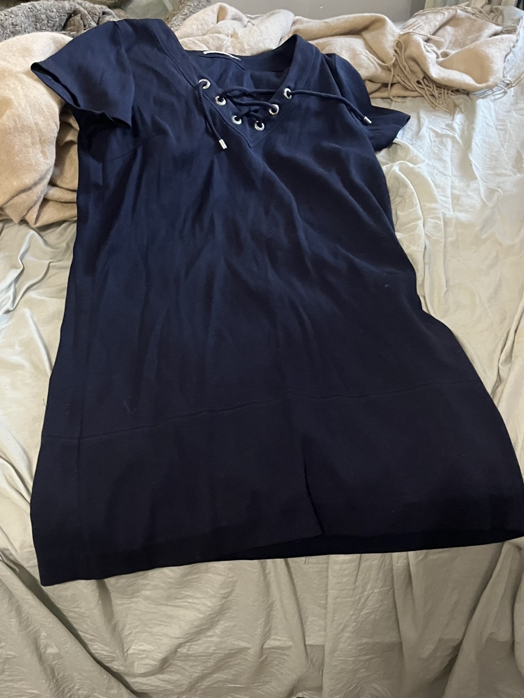 A simple navy blue dress, perfect for casual wear or dressing up with accessories! It has short sleeves and a comfortable fit. The material feels lightweight and breathable, making it great for warmer weather