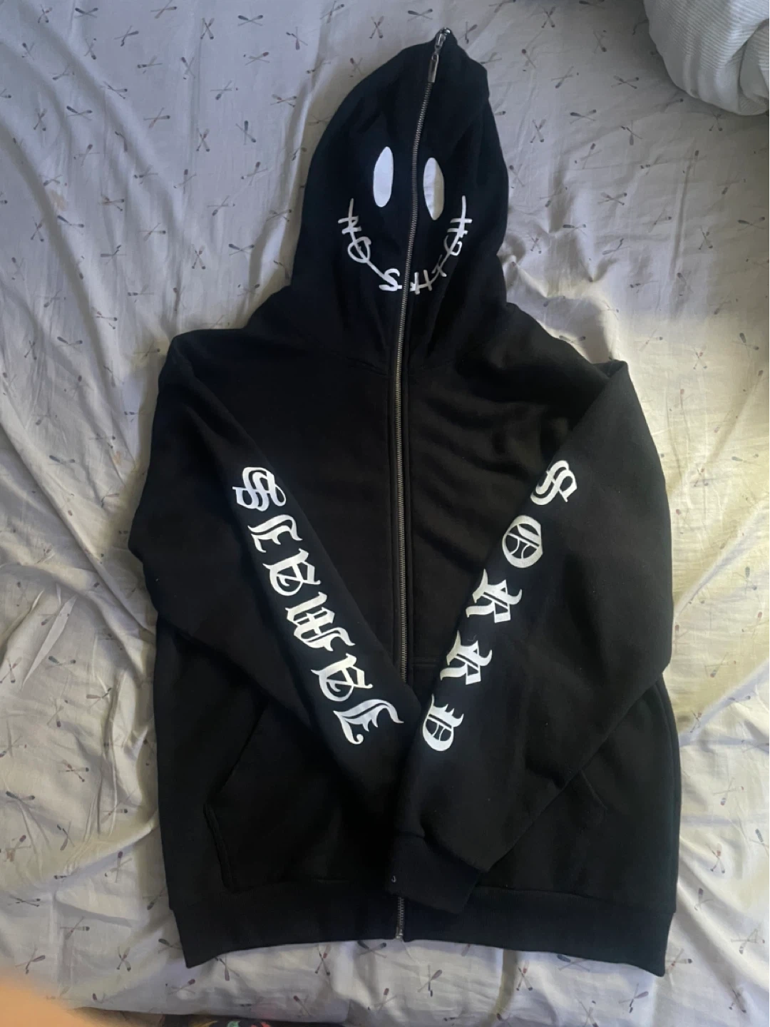 Selling a black Eleven Paris full zip up hoodie I got while in Paris it’s in men’s size medium. It's in great condition and features a unique design on the sleeves and hood.