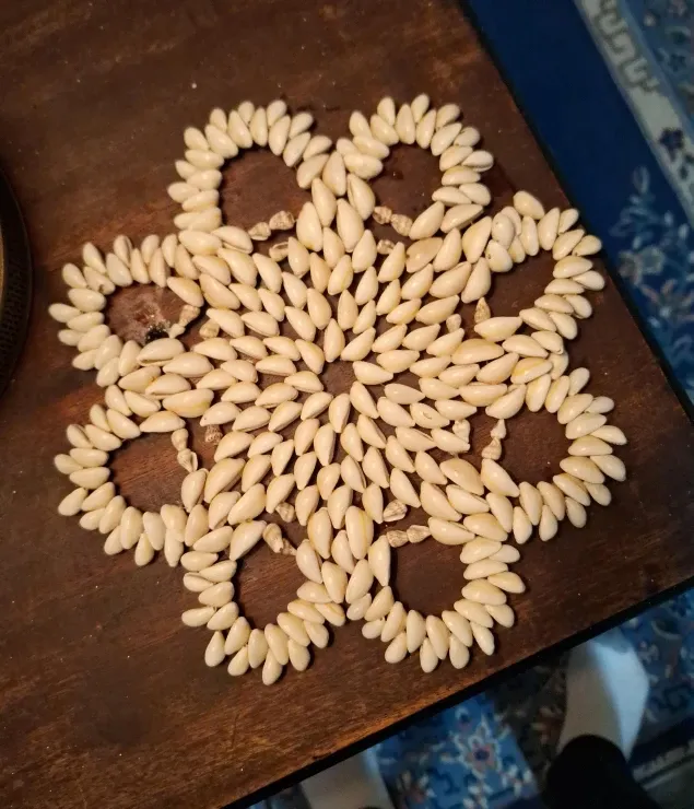 This is a unique, handmade decorative coaster made of seashells. It would add a nice touch to any table setting!