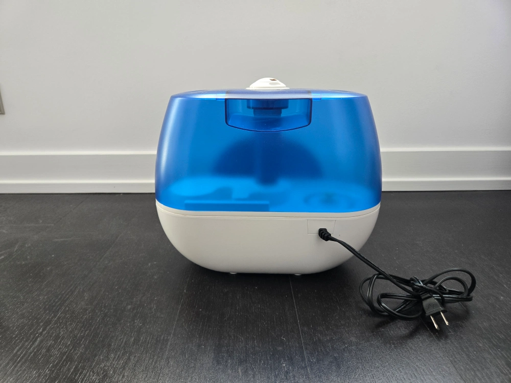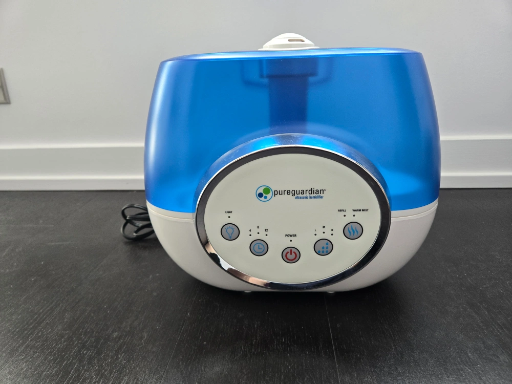 PureGuardian Ultrasonic Cool Mist Humidifier. Features a blue and white design - perfect for adding moisture to your home! It has a variety of different settings for light, power, and mist.