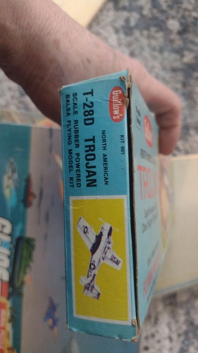 This is a Guillow's North American T-28D Trojan balsa wood model airplane kit. It is a scale, rubber-powered flying model kit. The kit includes balsa wood parts, tissue paper for covering, a propeller, and detailed building instructions. The finished model has a 16-inch wingspan. The T-28 was an advanced trainer aircraft used by the USAF. Condition: Used - Good. For Sale By: Owner. Curbside pick up: Yes. Cash accepted: Yes.