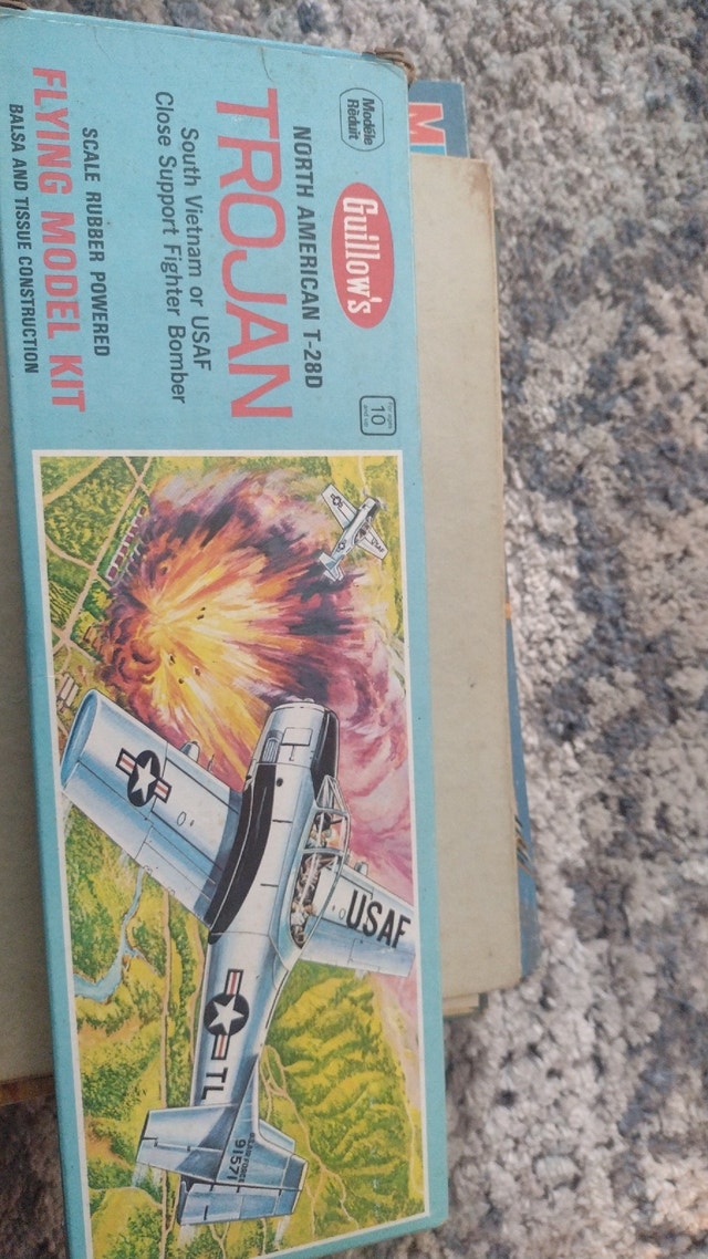 This is a Guillow's North American T-28D Trojan balsa wood model airplane kit. It is a scale, rubber-powered flying model kit. The kit includes balsa wood parts, tissue paper for covering, a propeller, and detailed building instructions. The finished model has a 16-inch wingspan. The T-28 was an advanced trainer aircraft used by the USAF. Condition: Used - Good. For Sale By: Owner. Curbside pick up: Yes. Cash accepted: Yes.