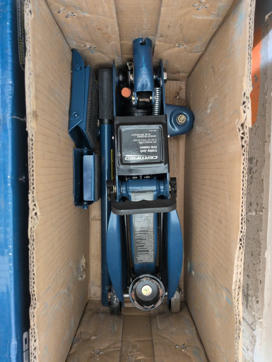 This Certified trolley jack and axle stand combo kit comes with 5 pieces. It includes a trolley jack with a 5 1/8"-13" (13-33 cm) lift range and axle stands for easy height adjustment. Wheel chocks are also included for added safety. The jack has a 2-ton capacity.