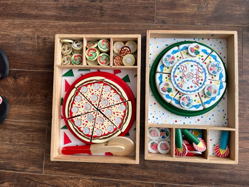 Meliss and Doug. A wooden playset with a pizza and a birthday cake. Both the pizza and cake are segmented and can be separated into slices. The set also includes extra toppings for the pizza and candles for the cake.