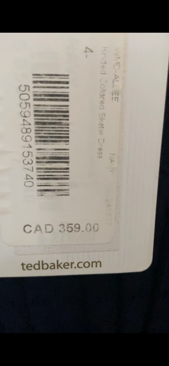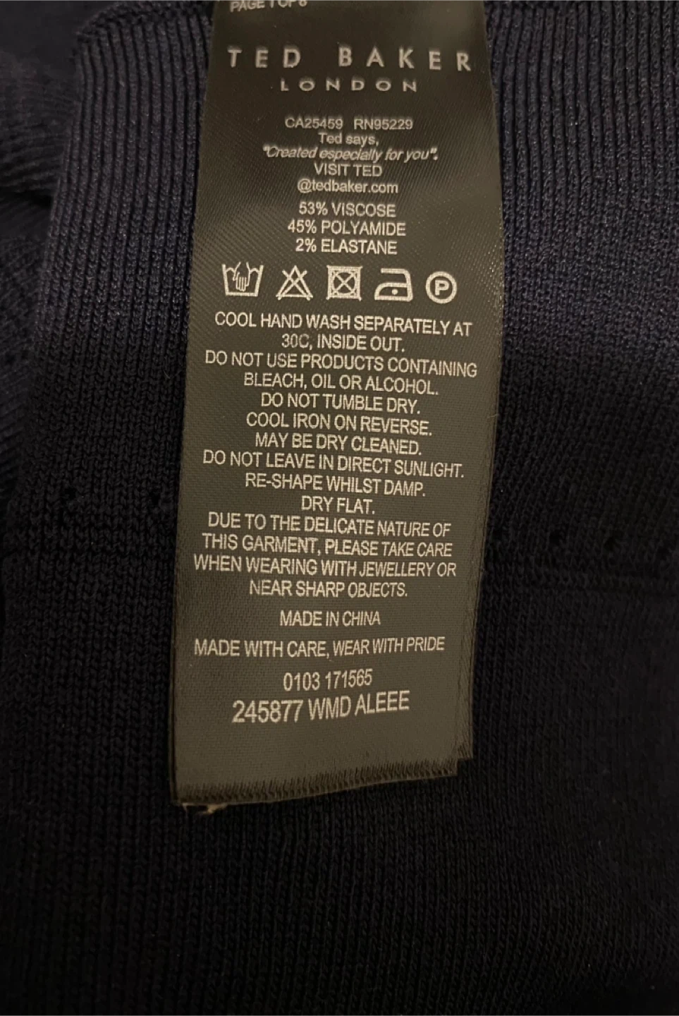 Ted Baker navy dress. Made with 53% viscose, 45% polyamide, and 2% elastane. Dry flat care instructions. This dress is a US size 4. Regular price $359.00 selling for $70