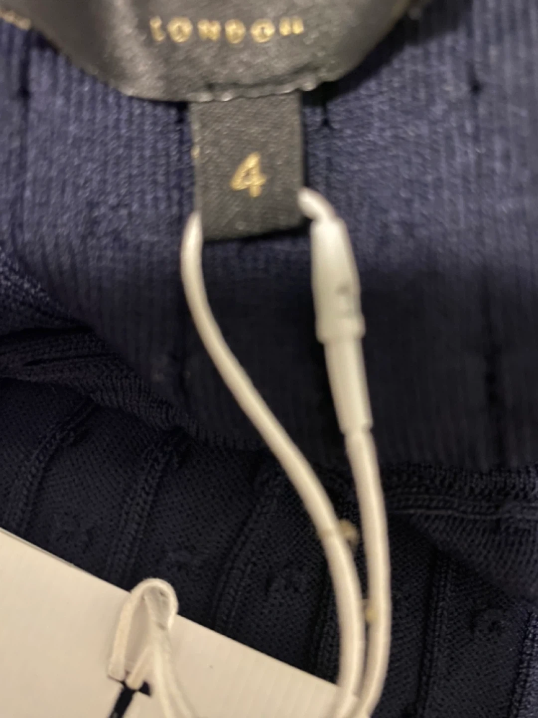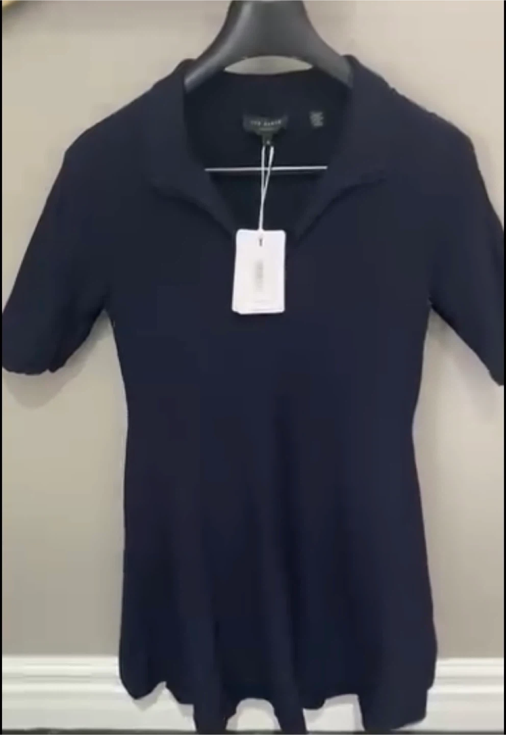 Ted Baker navy dress. Made with 53% viscose, 45% polyamide, and 2% elastane. Dry flat care instructions. This dress is a US size 4. Regular price $359.00 selling for $70