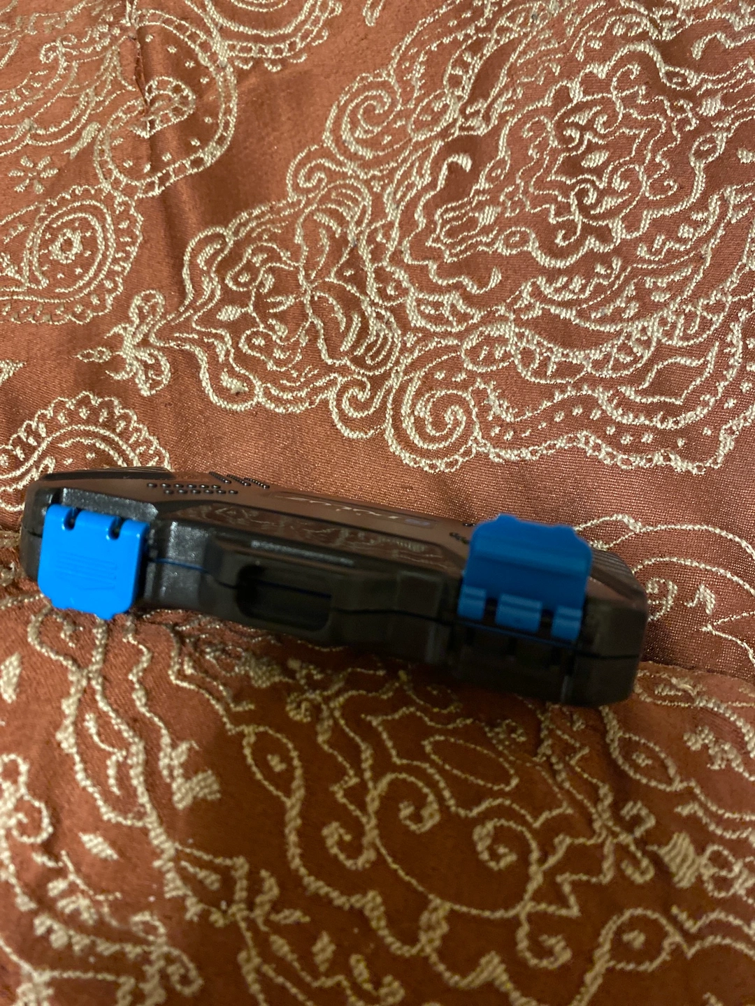 It is black with blue interior and blue tabs for entry.