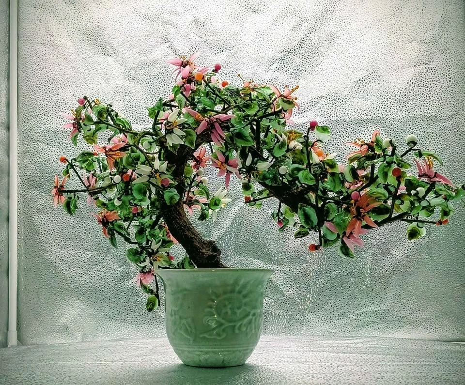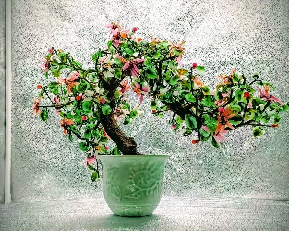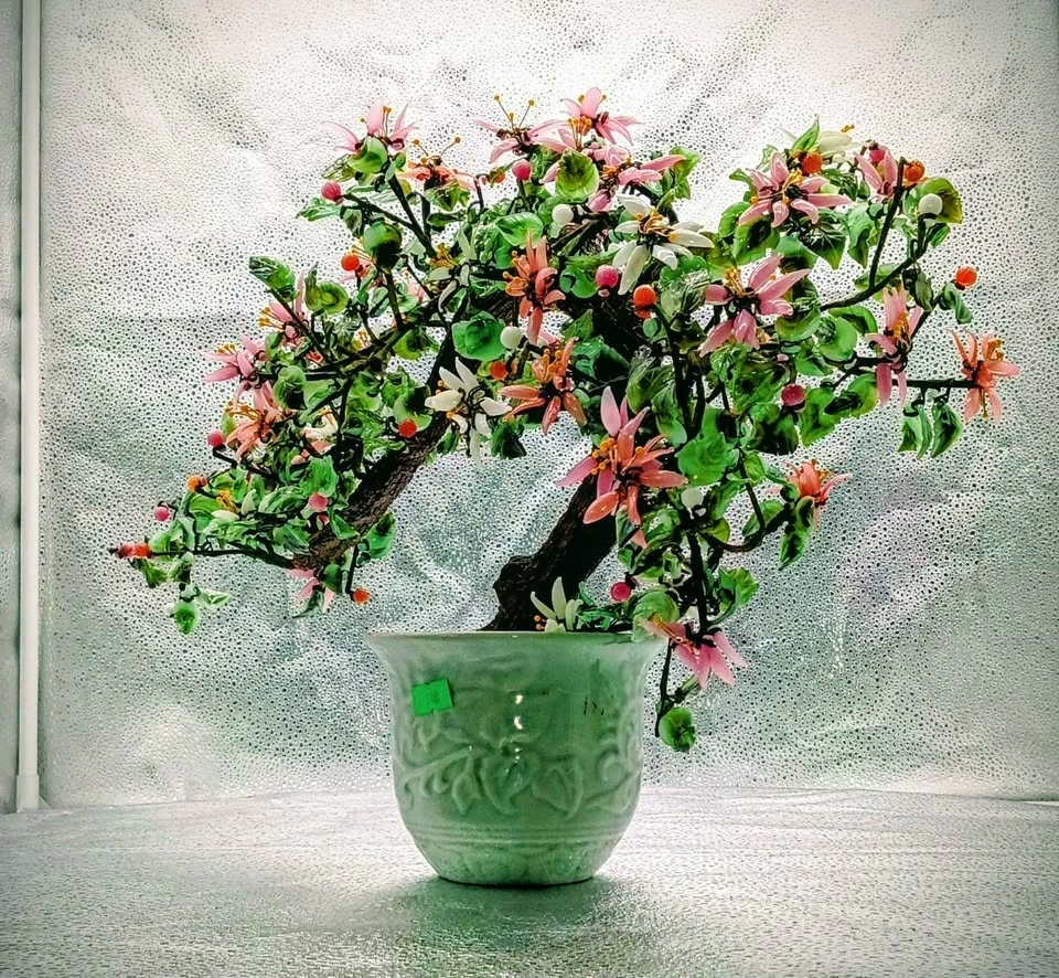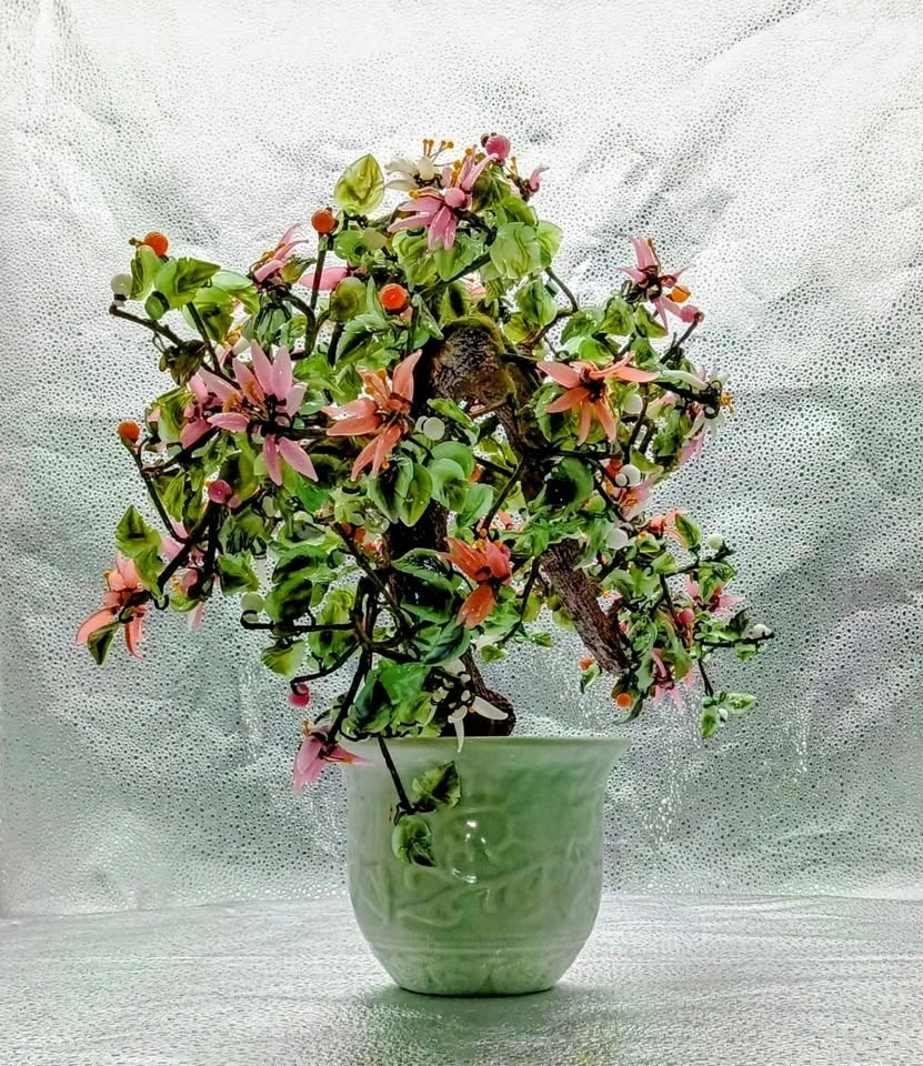 This is a vintage Chinese glass and jade stone cherry blossom bonsai tree sculpture. It features pink glass flowers, green Jade leaves, and a celadon-colored ceramic pot. The design is intricately done to represent balance and harmony, with adjustable petals and leaves.