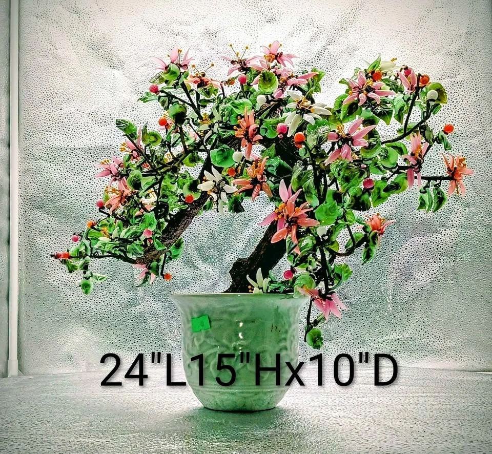 This is a vintage Chinese glass and jade stone cherry blossom bonsai tree sculpture. It features pink glass flowers, green Jade leaves, and a celadon-colored ceramic pot. The design is intricately done to represent balance and harmony, with adjustable petals and leaves.