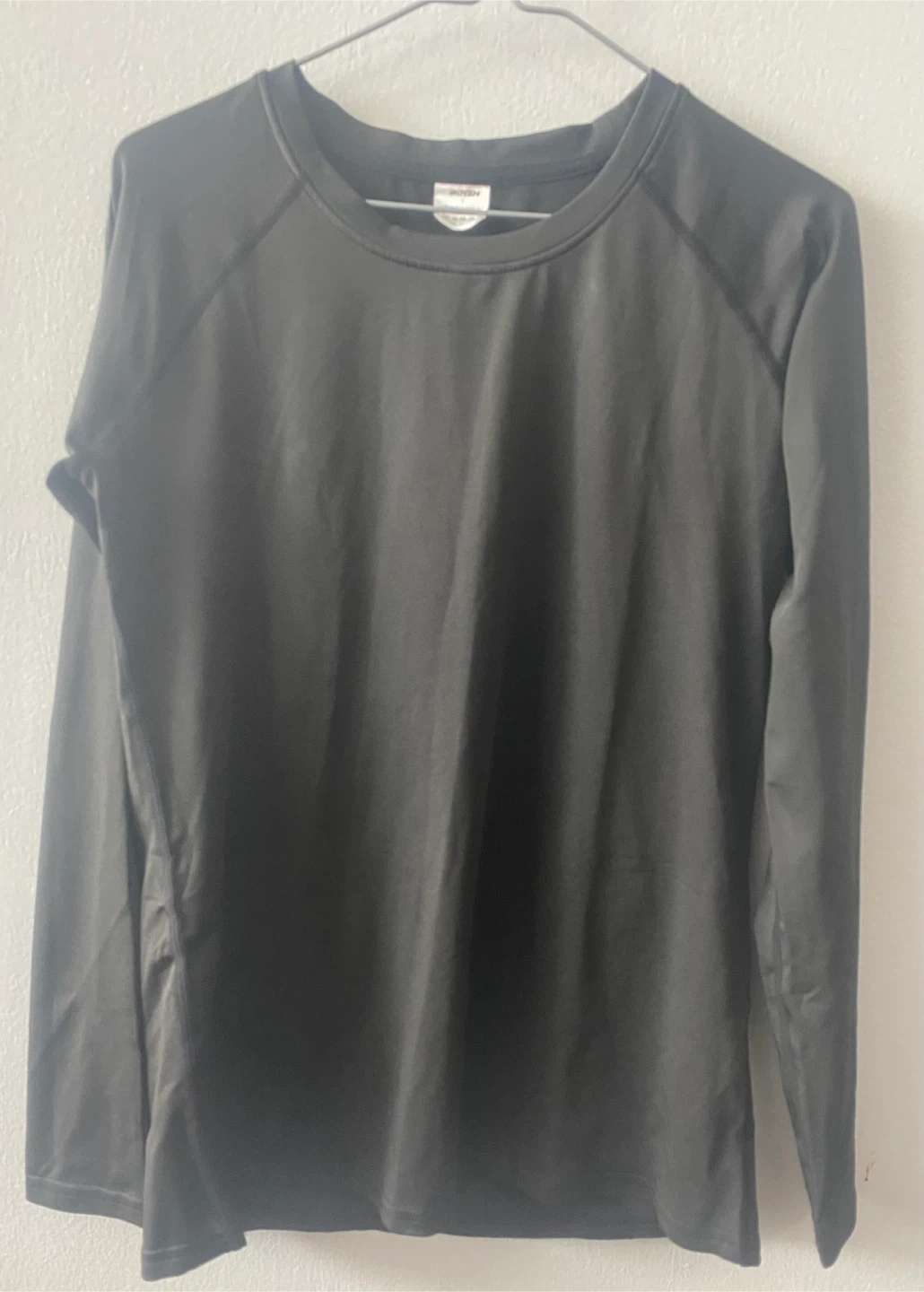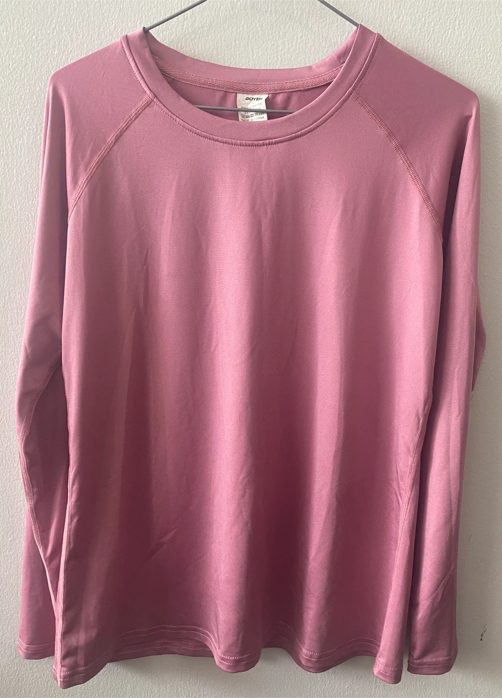 This is a pack of three Boyzn long sleeve athletic shirts. They are made of 85% polyester and 15% spandex. Includes one blue, one pink, and one black shirt. Each shirt is size small.
