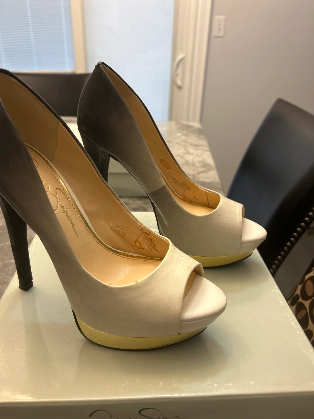 Stylish ombre peep-toe platform heels. Black and grey suede-like material. Gold platform and heel detail. High heels. In original box.