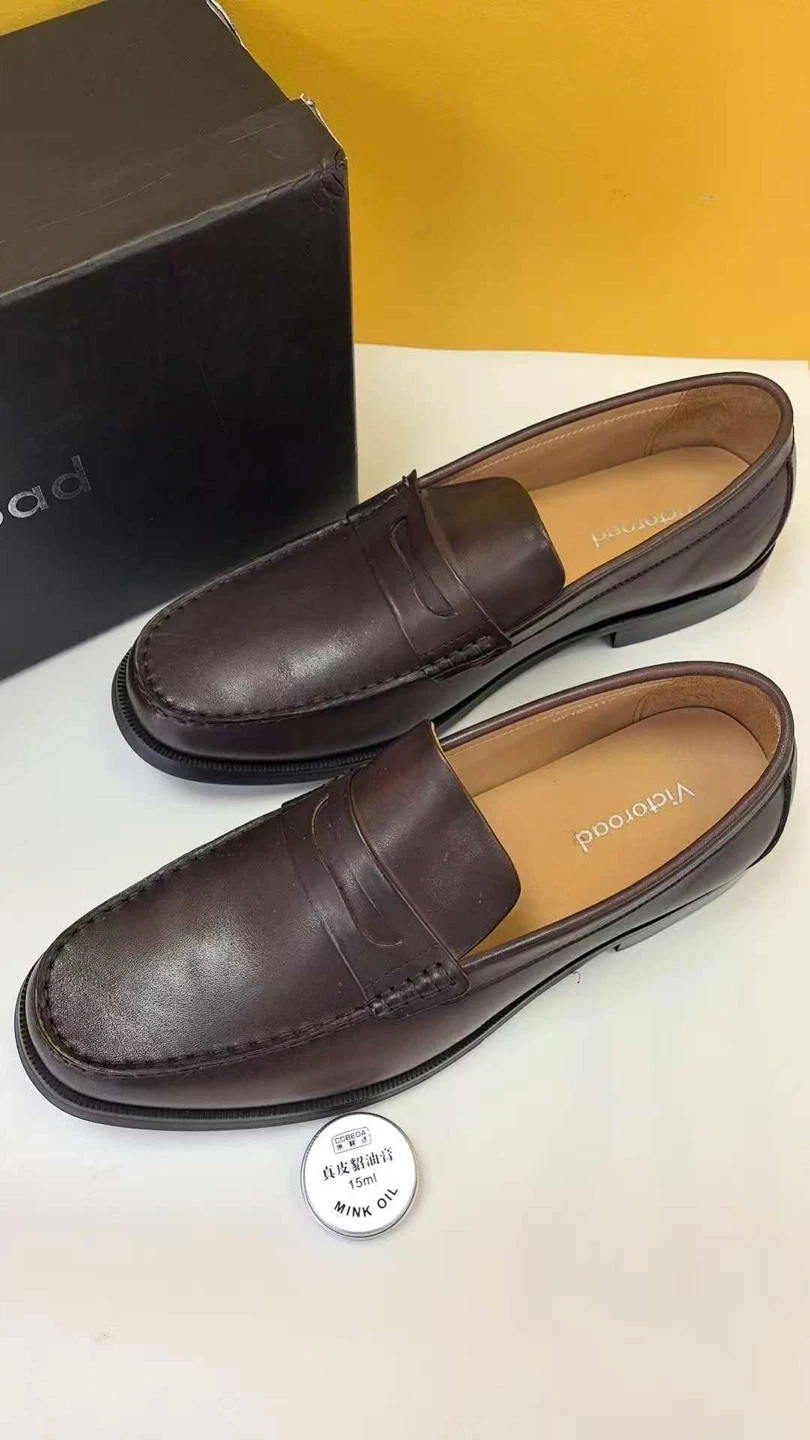 These are men's Victorroad penny loafers in a rich brown calf leather. They feature a classic penny loafer design with a strap across the vamp. The soles are rubber for durability. Includes a tin of mink oil.