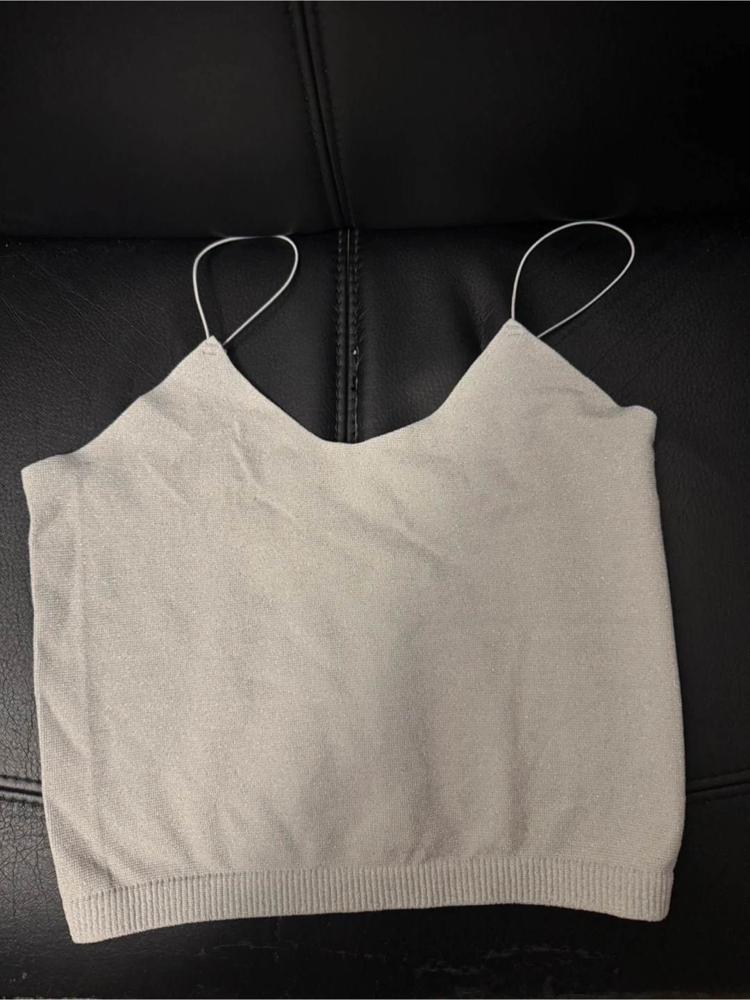 Selling a cute silver cami top! It's in great condition and ready for a new home. The material has a subtle shimmer, making it perfect for dressing up or down. It's a lightweight knit material. Never worn!