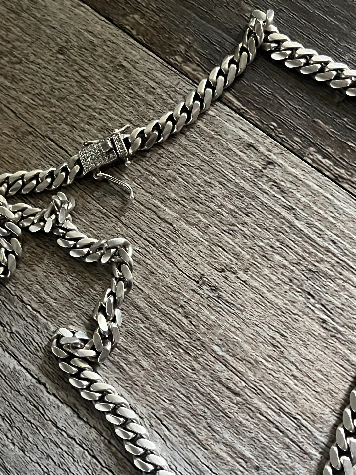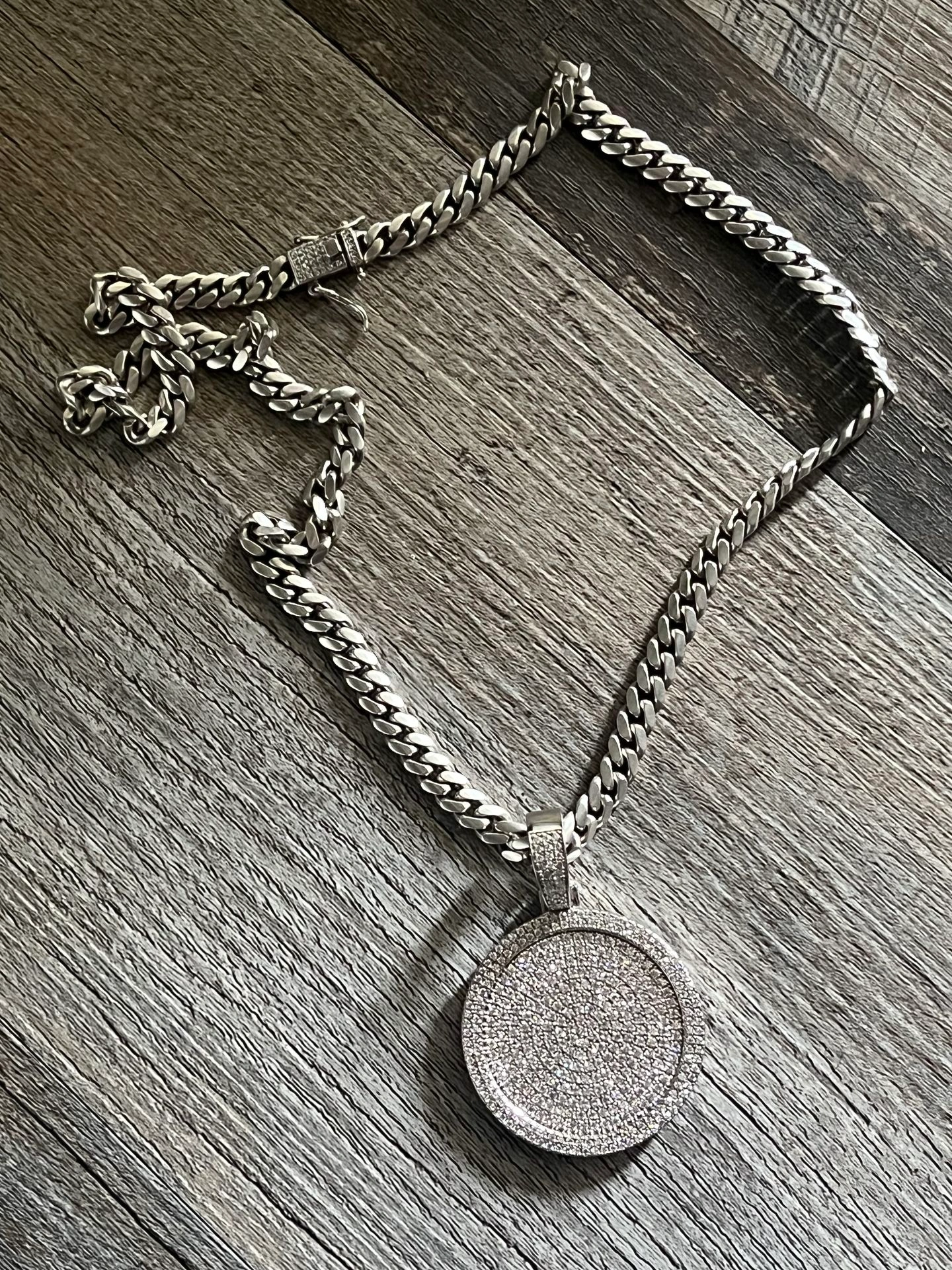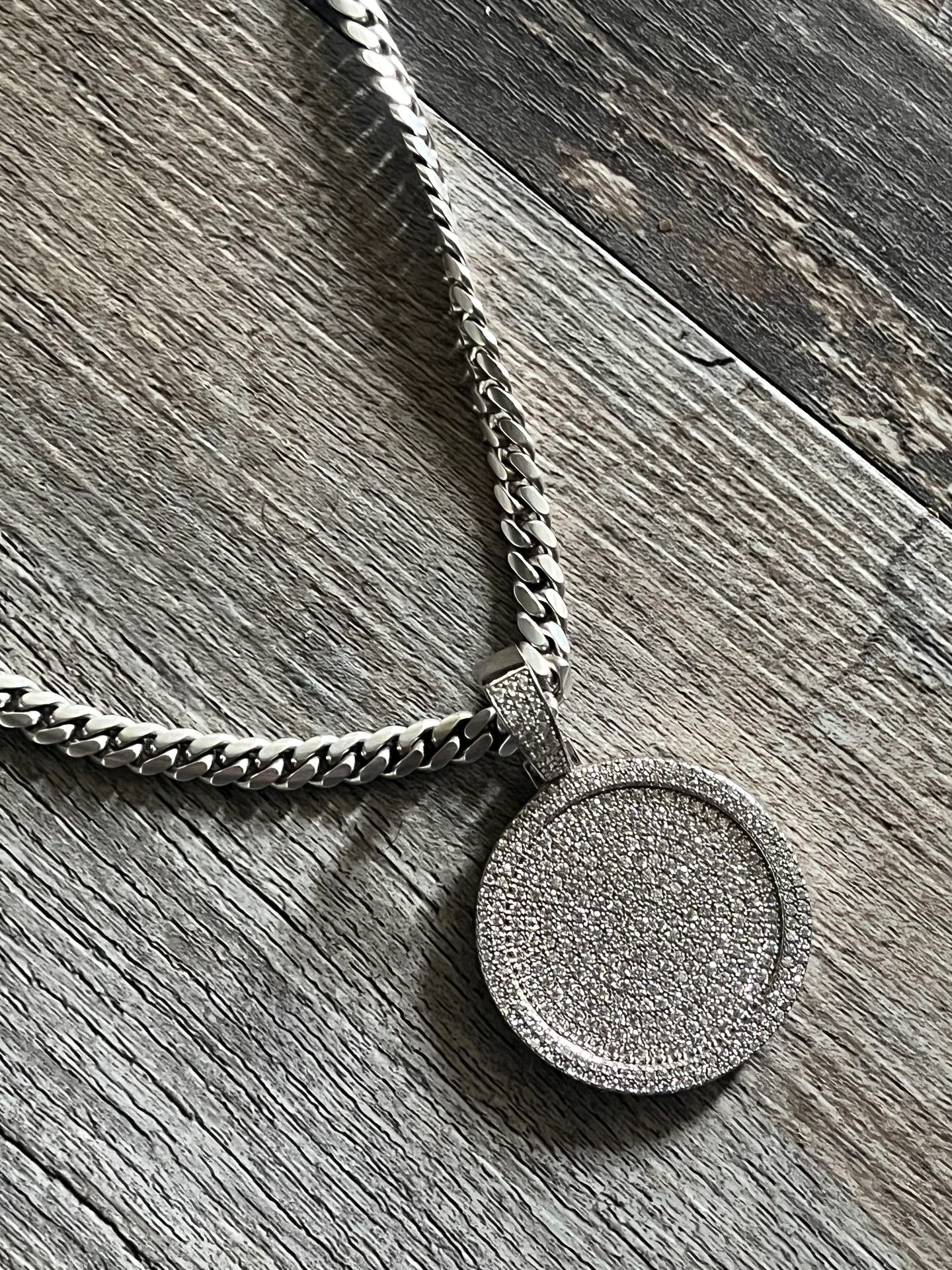 20 inch silver chain, real 925 silver. Features moissanite diamonds on the lock and a medallion with moissanite diamonds (3K).