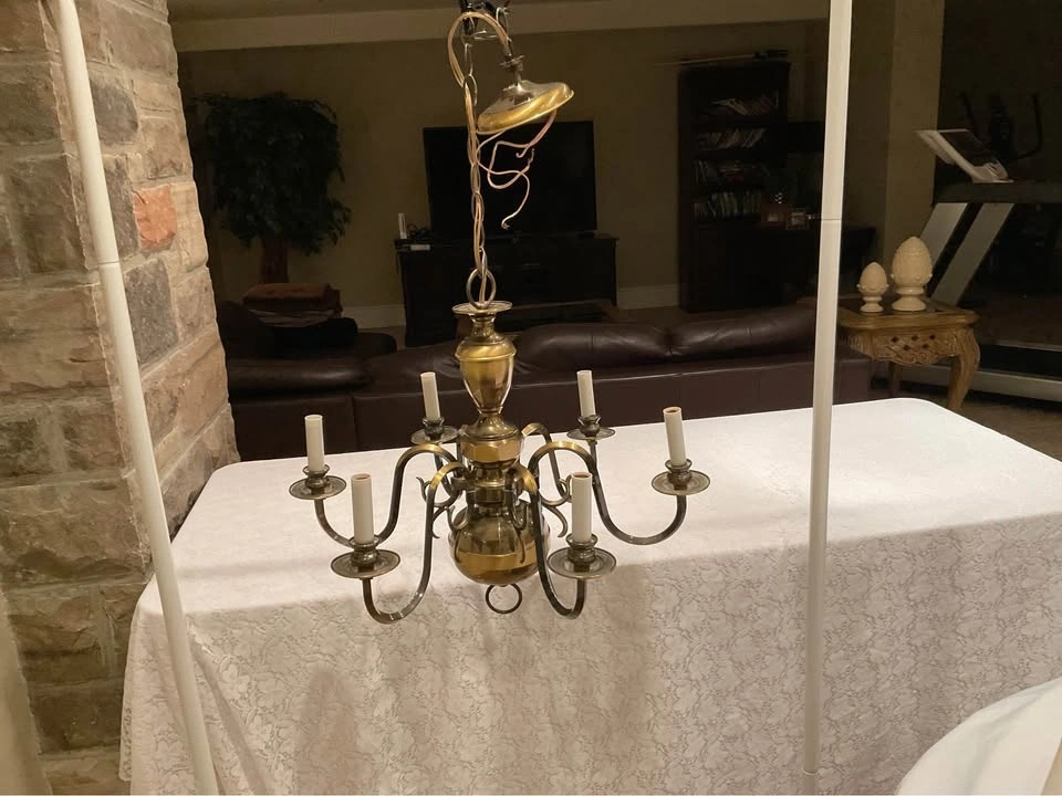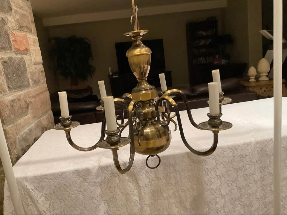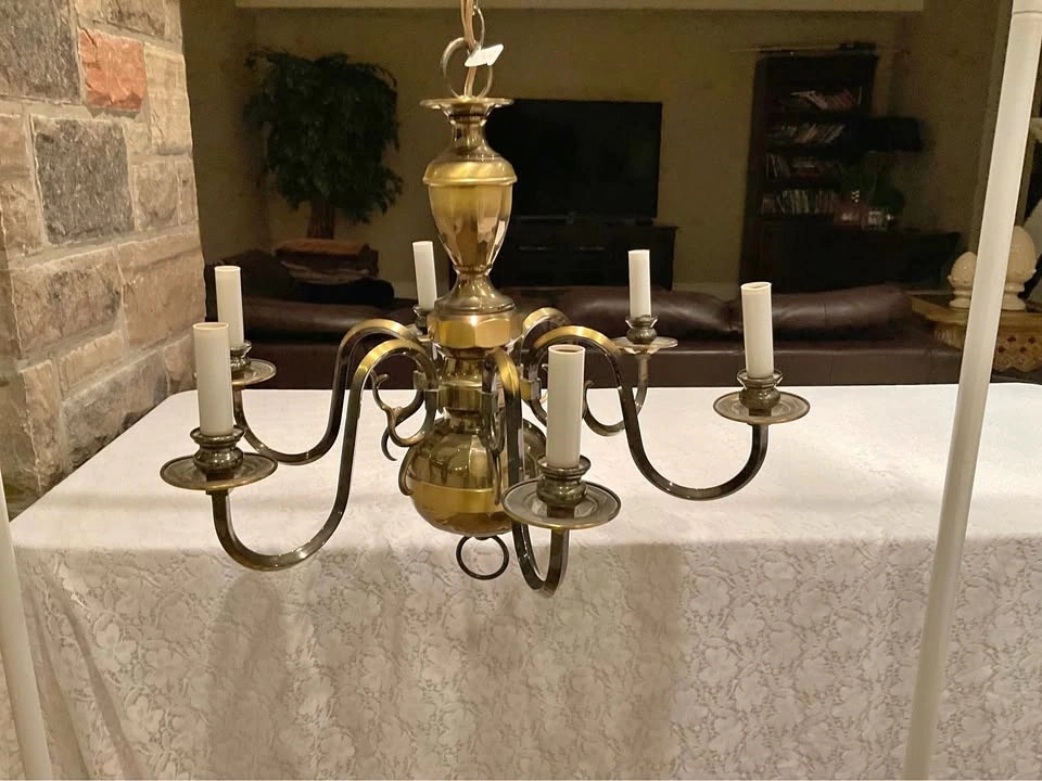 Stunning vintage Mid Century brass traditional chandelier made in Spain by Pradas. Excellent condition! Very heavy solid brass piece. Light arm to light arm circumference is 23 1/2 inches. Chain is 16 inches. Top of fixture to bottom is 18 1/2 inches (not including chain). Bottom circumference is 17 inches. From a smoke & pet free home. Cash only in Richmond Hill (Bathurst & King Rd).