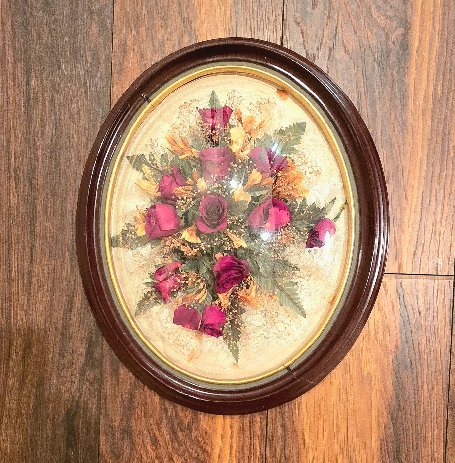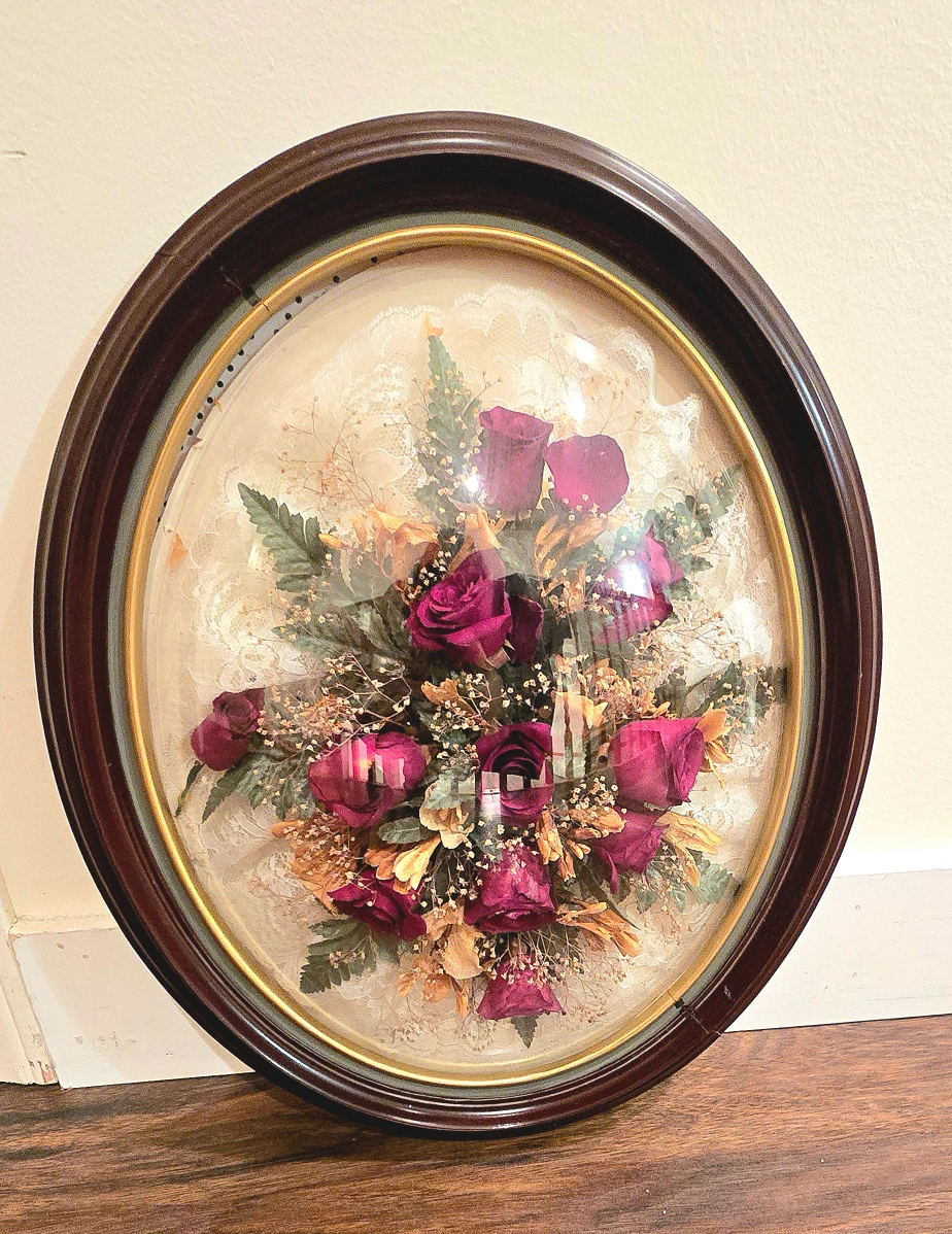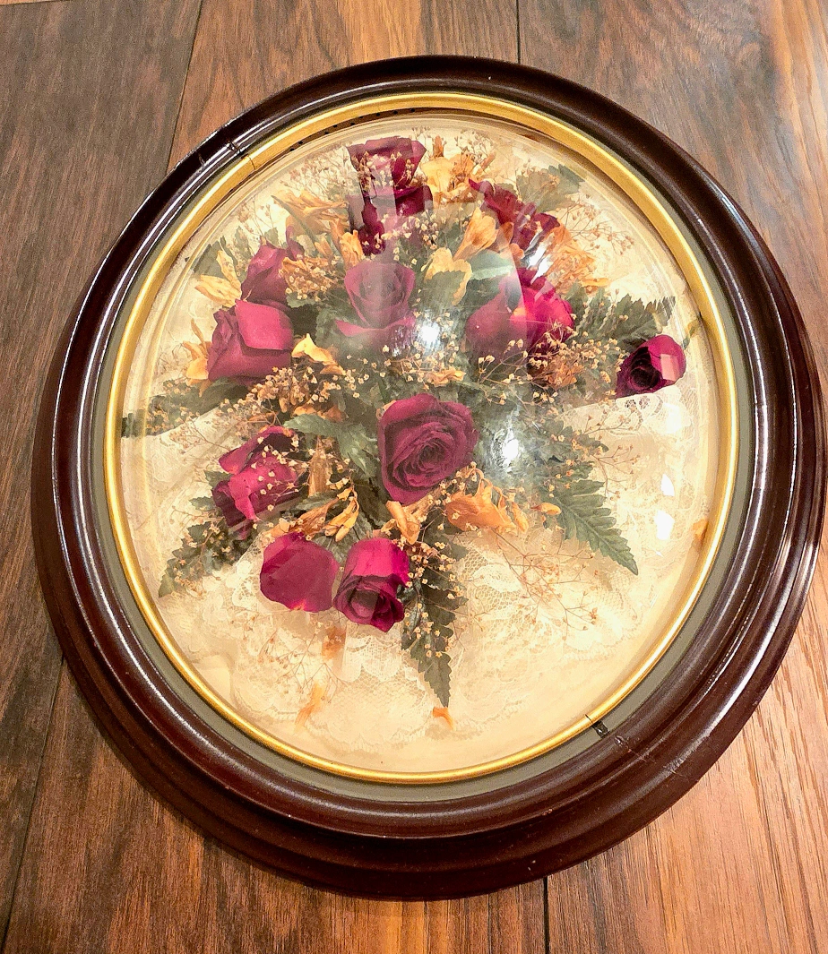 Framed dried flower bouquet with a glass dome. Roses and other dried botanicals are arranged on a lace background.