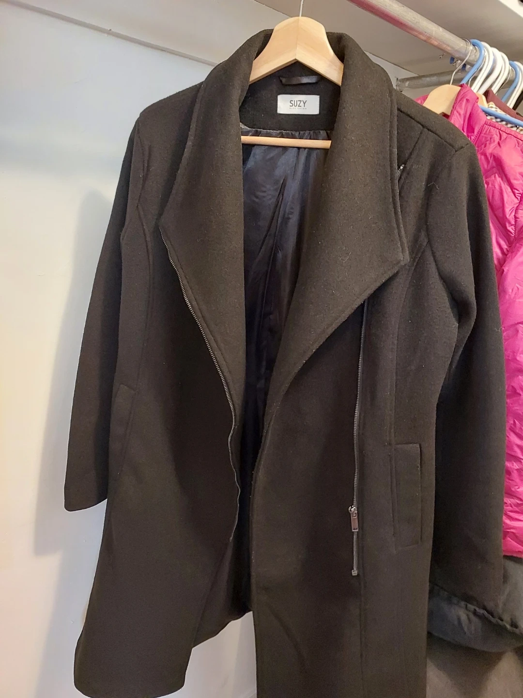 This is a SUZY brand black wool blend coat. It's a medium weight jacket, perfect for cooler weather. The coat has an asymmetrical zip closure and a stylish wide collar.