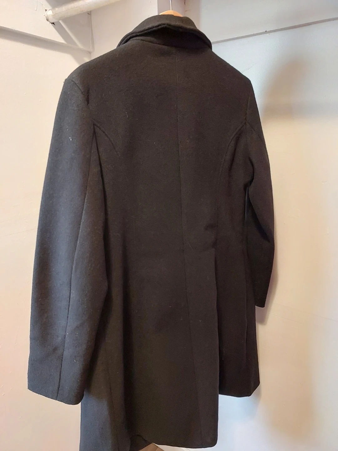 This is a SUZY brand black wool blend coat. It's a medium weight jacket, perfect for cooler weather. The coat has an asymmetrical zip closure and a stylish wide collar.