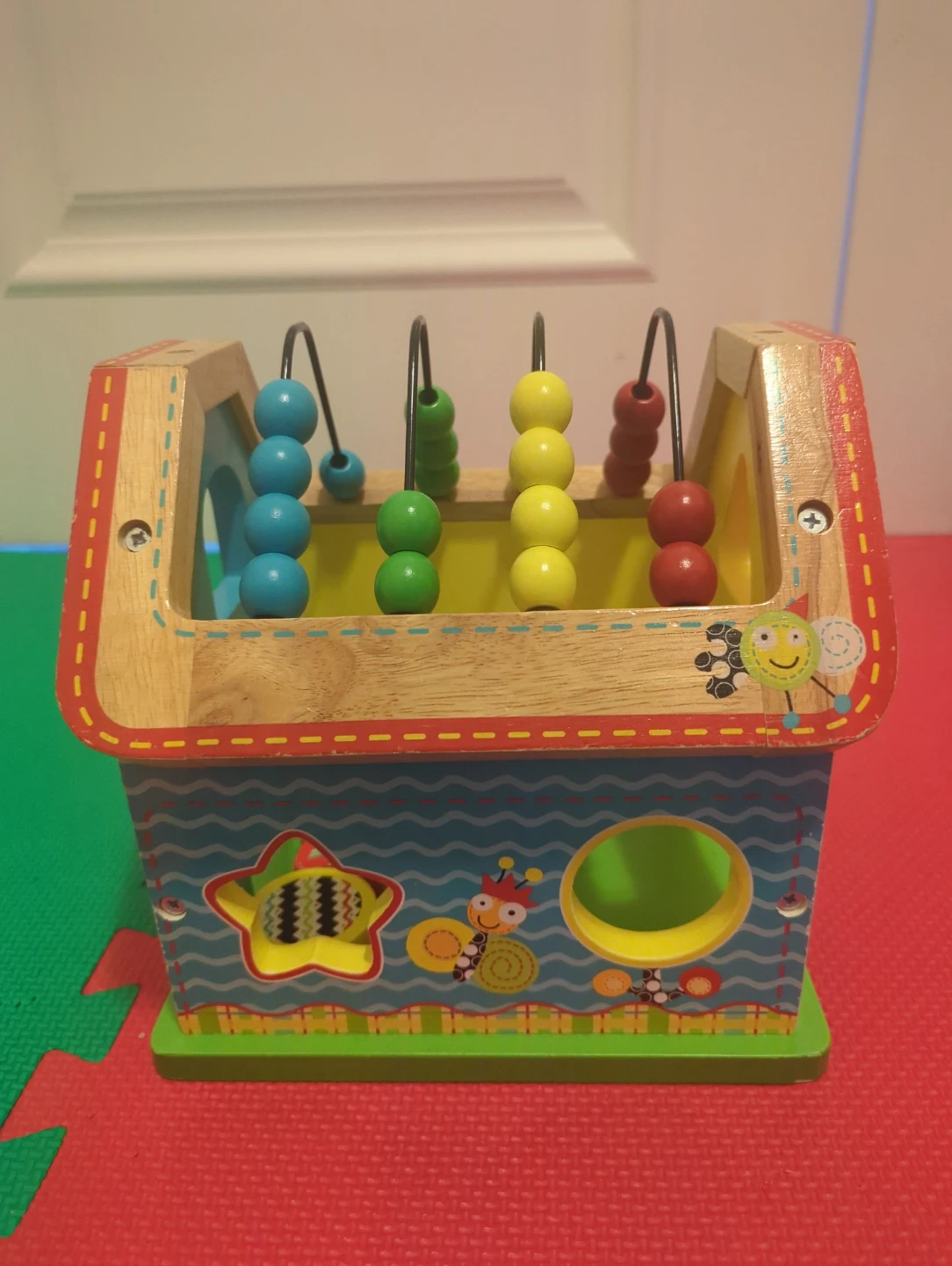 This wooden bead maze house toy features colourful beads for counting and sorting. It includes shape sorting elements inside the house. Designed for little ones learning fine motor skills.