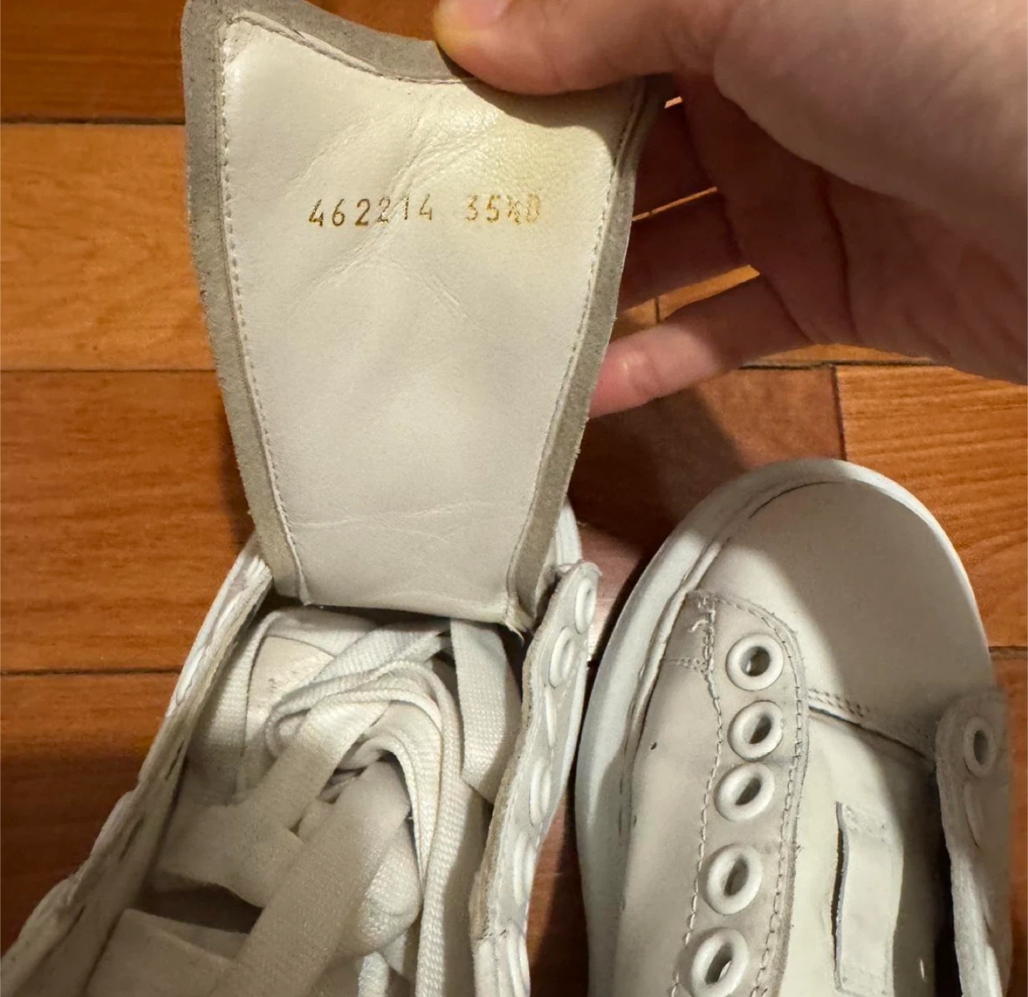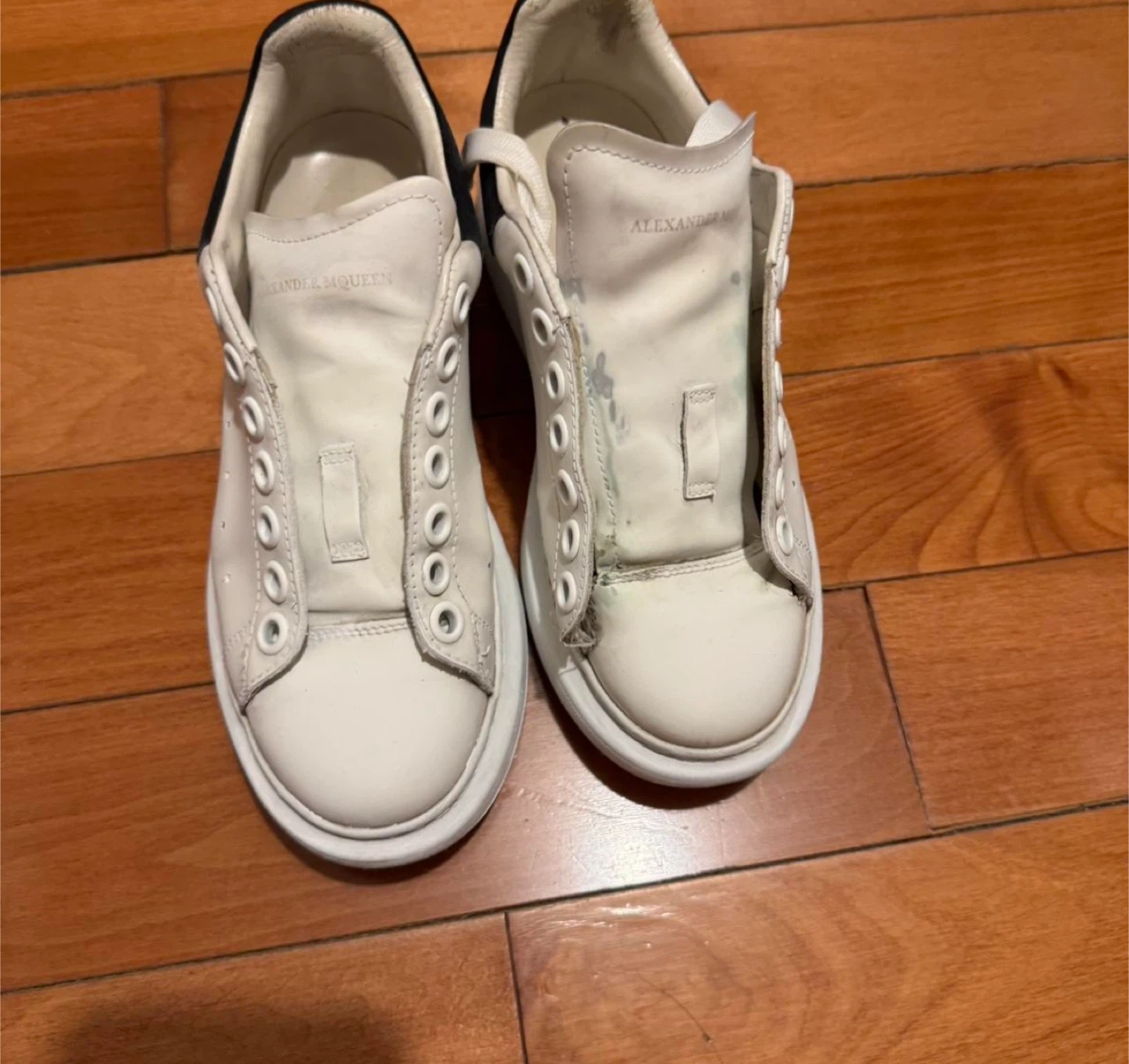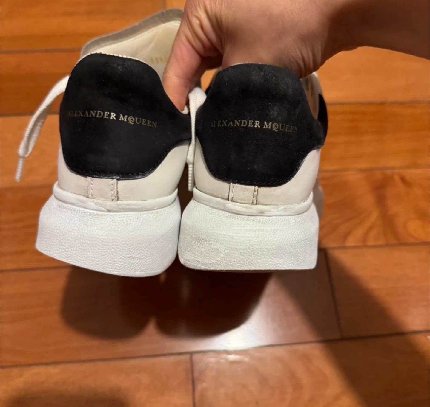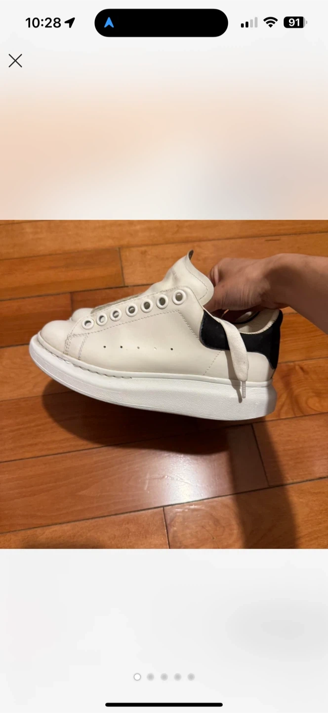 Selling a pair of Alexander McQueen oversized sneakers. They're white with black heel tabs. Leather material.
