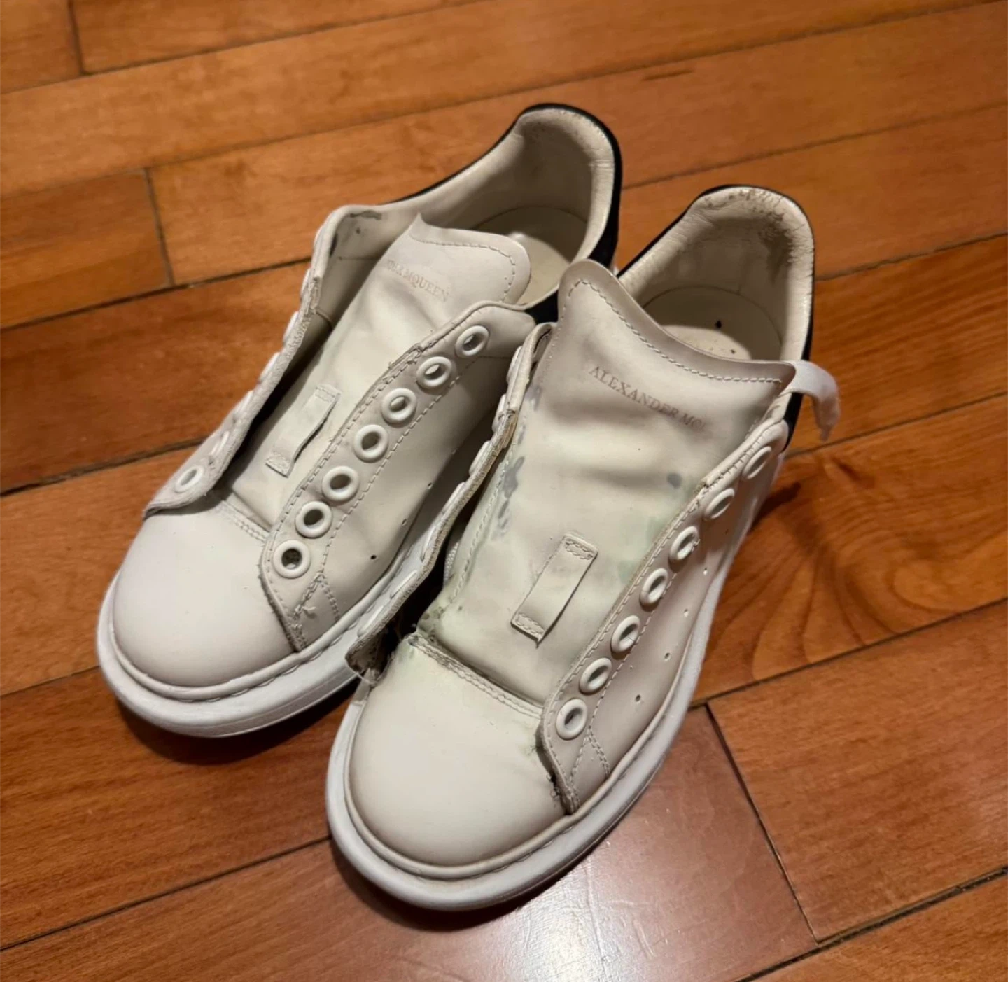Selling a pair of Alexander McQueen oversized sneakers. They're white with black heel tabs. Leather material.
