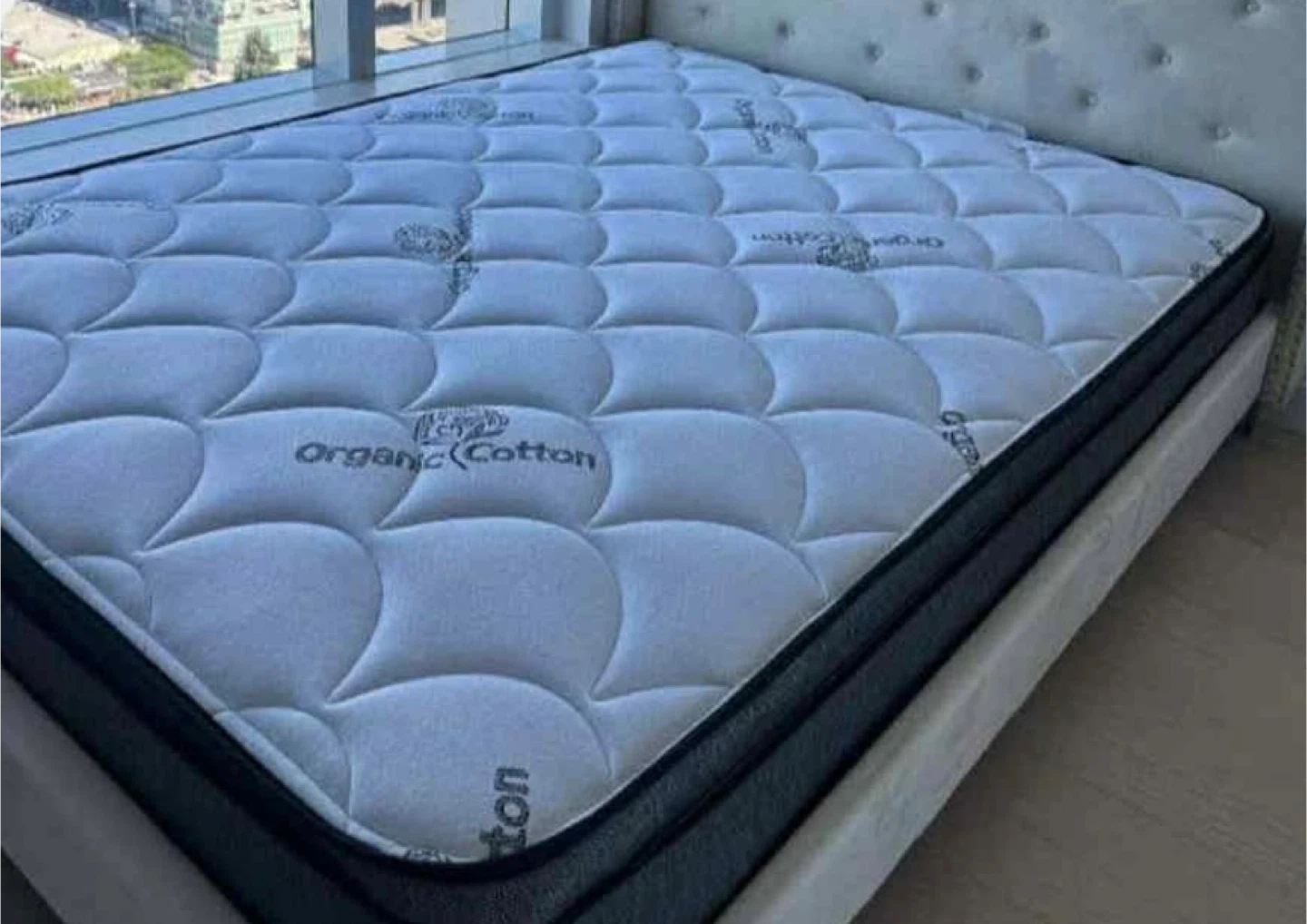 Sturdy bed frame with classy cream coloured velvety headboard. The mattress is 9 inch thick spring mattress. It is a double bed. I bought it 2 months ago but unfortunately I will be moving to Edmonton by the end of February so now it has to go. The pillows are free with the bed frame and the mattress. I can also add a 100% pure cotton fitted sheet for free as well.