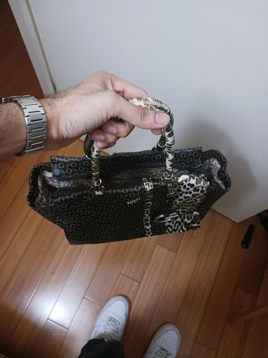 Guess Monogram Tote Purse with Leopard Strap – Great Condition
