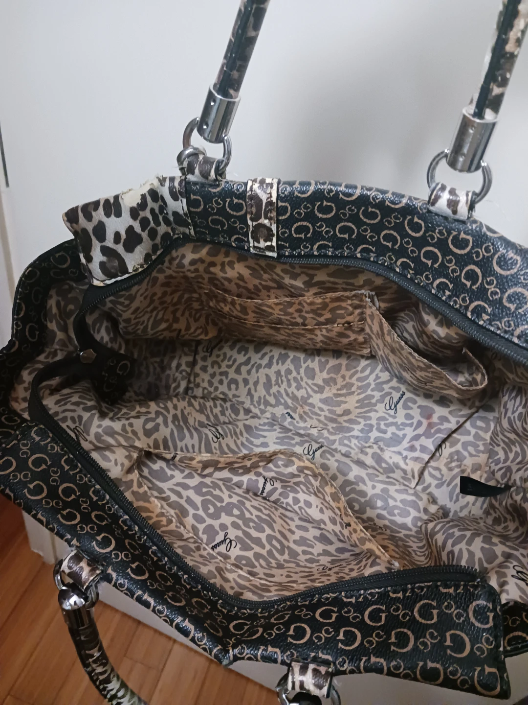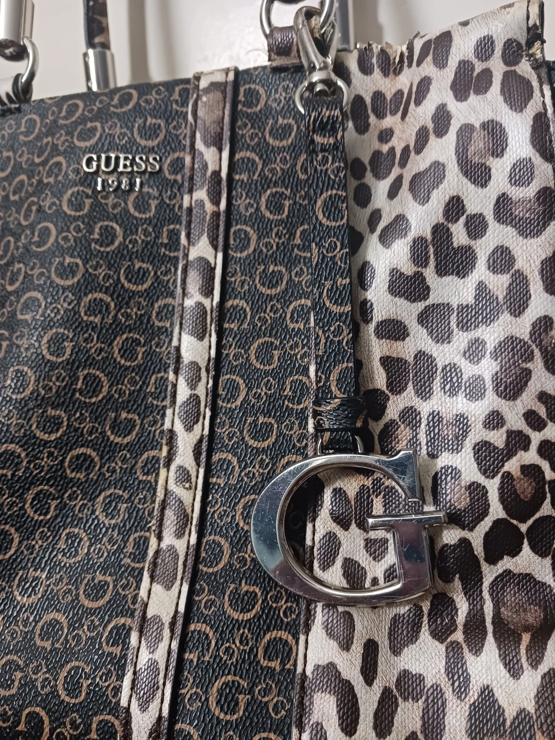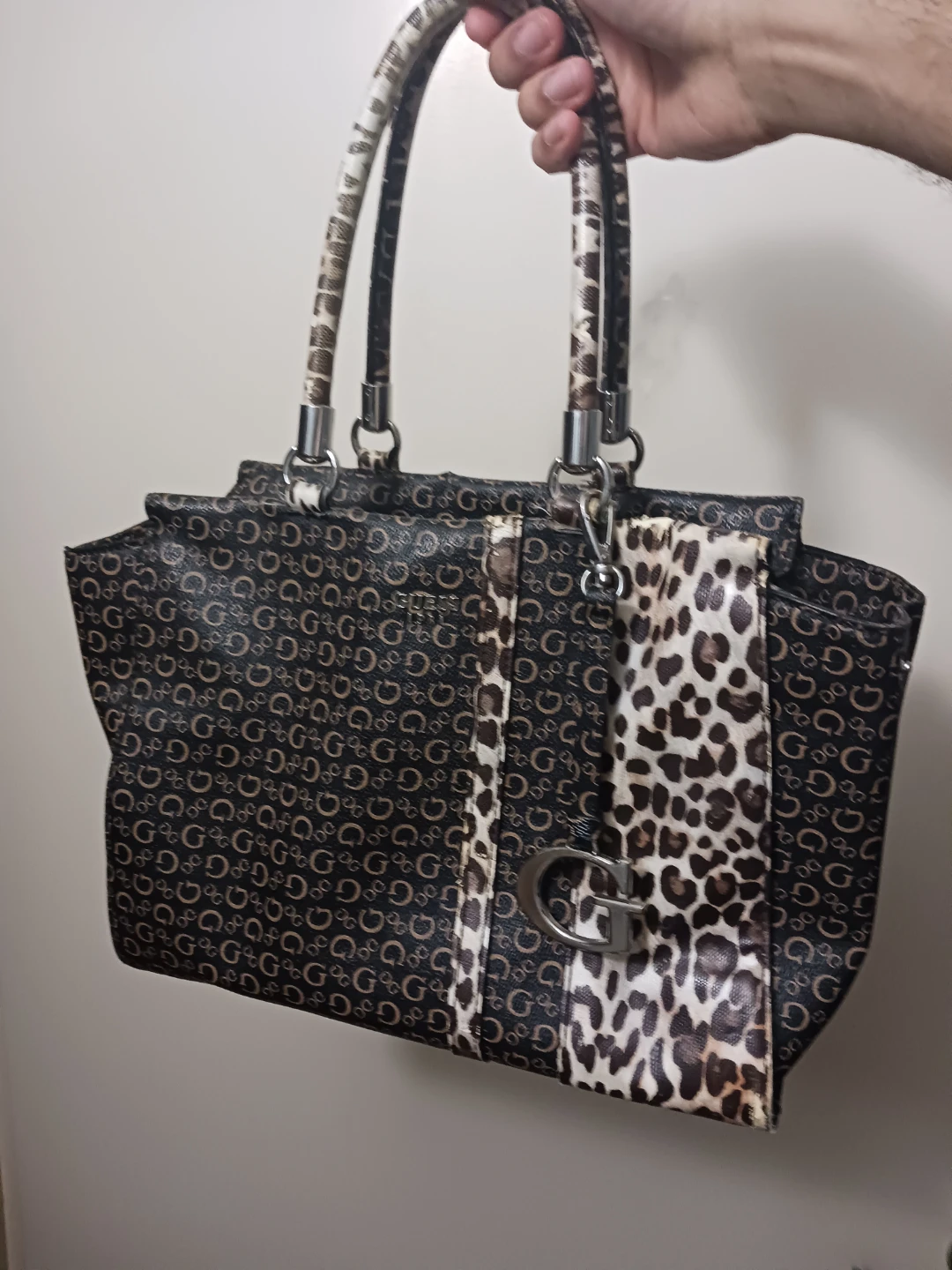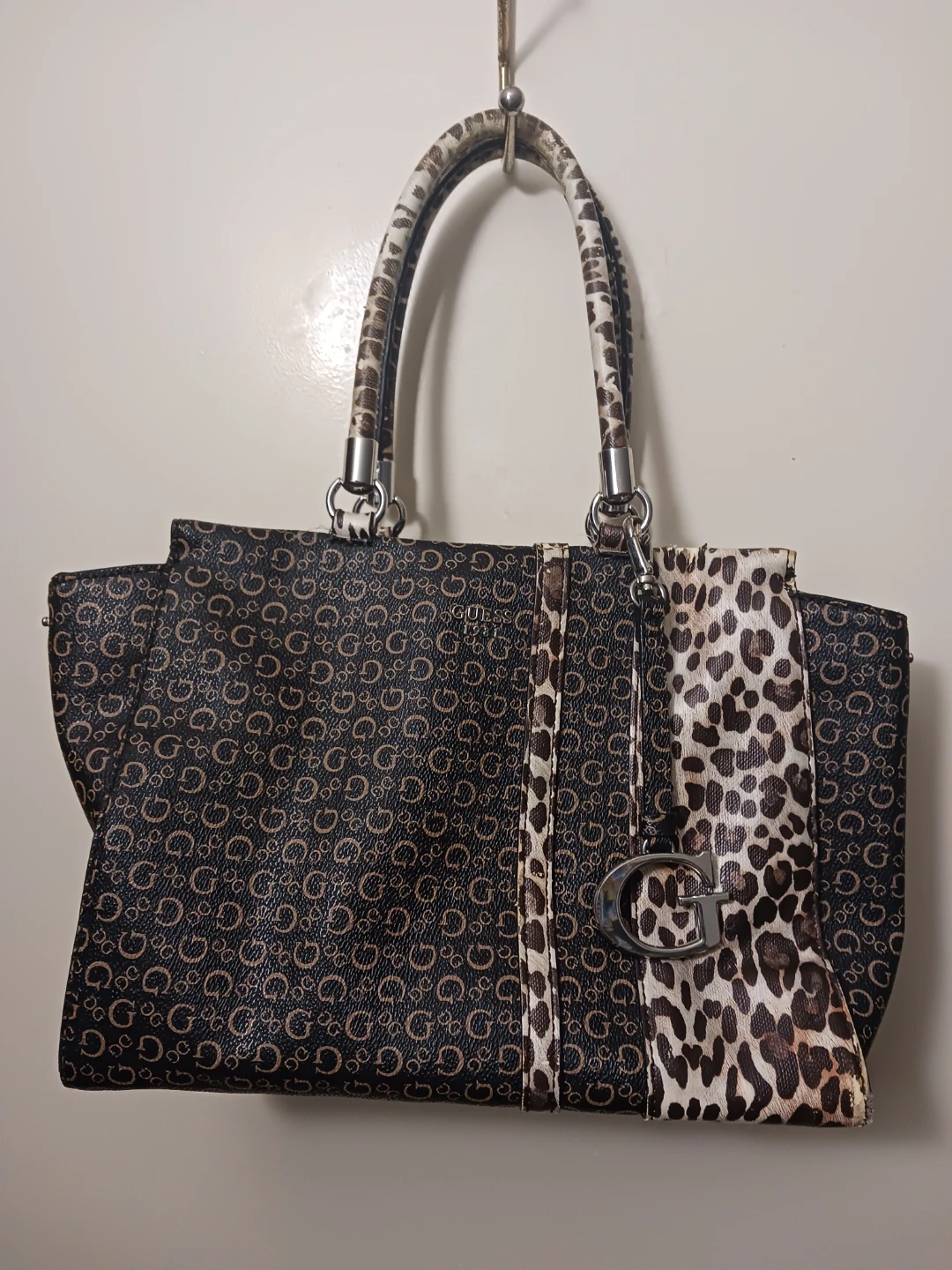 Guess Monogram Tote Purse with Leopard Strap – Great Condition