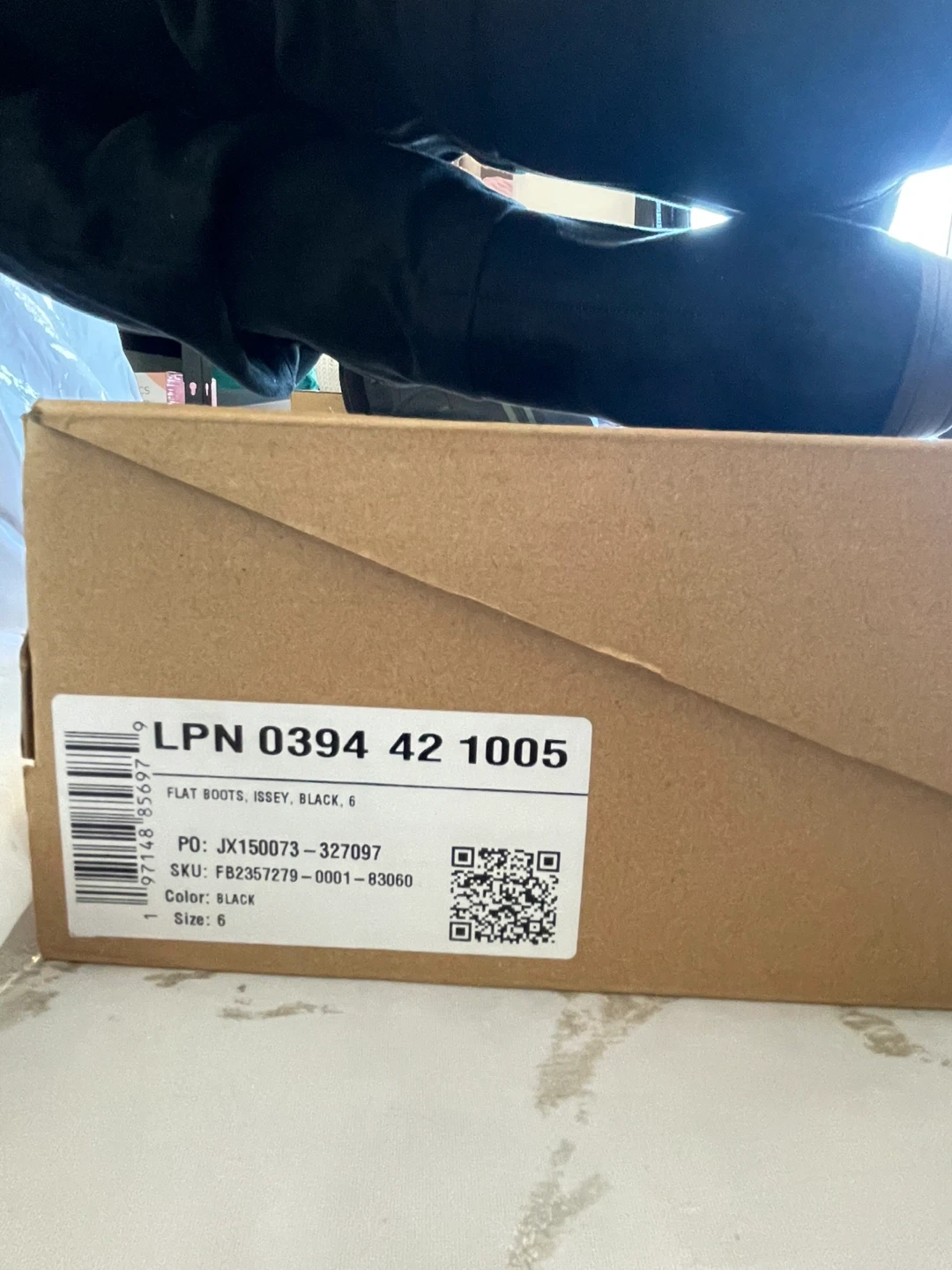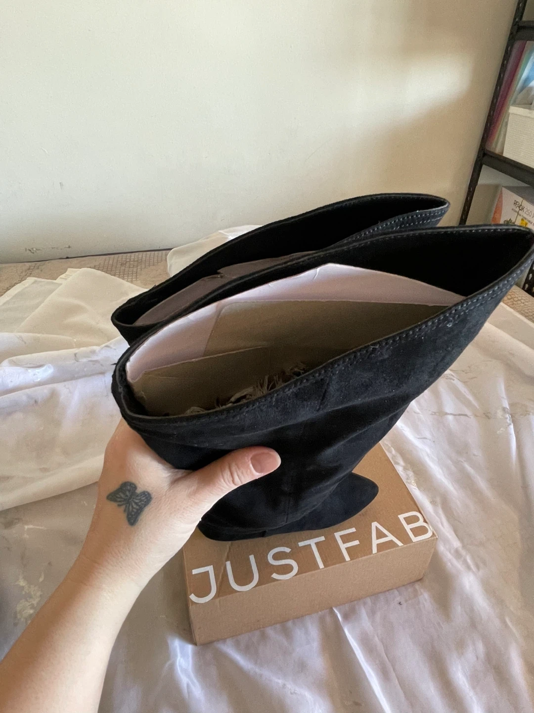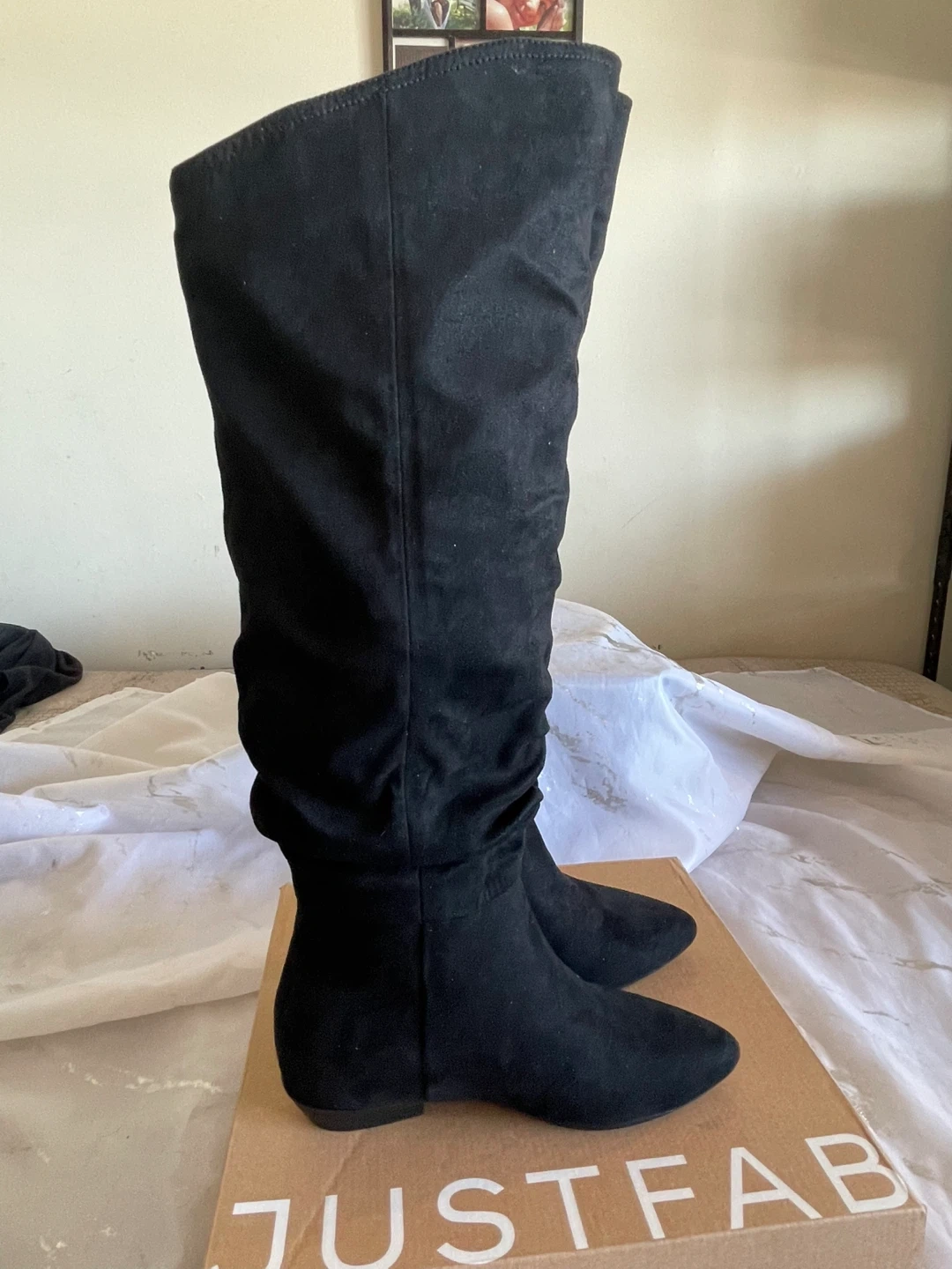These are black suede flat boots from JustFab. They're a size 6 and have a ruched shaft design. Comes with the original box. They have never been worn.