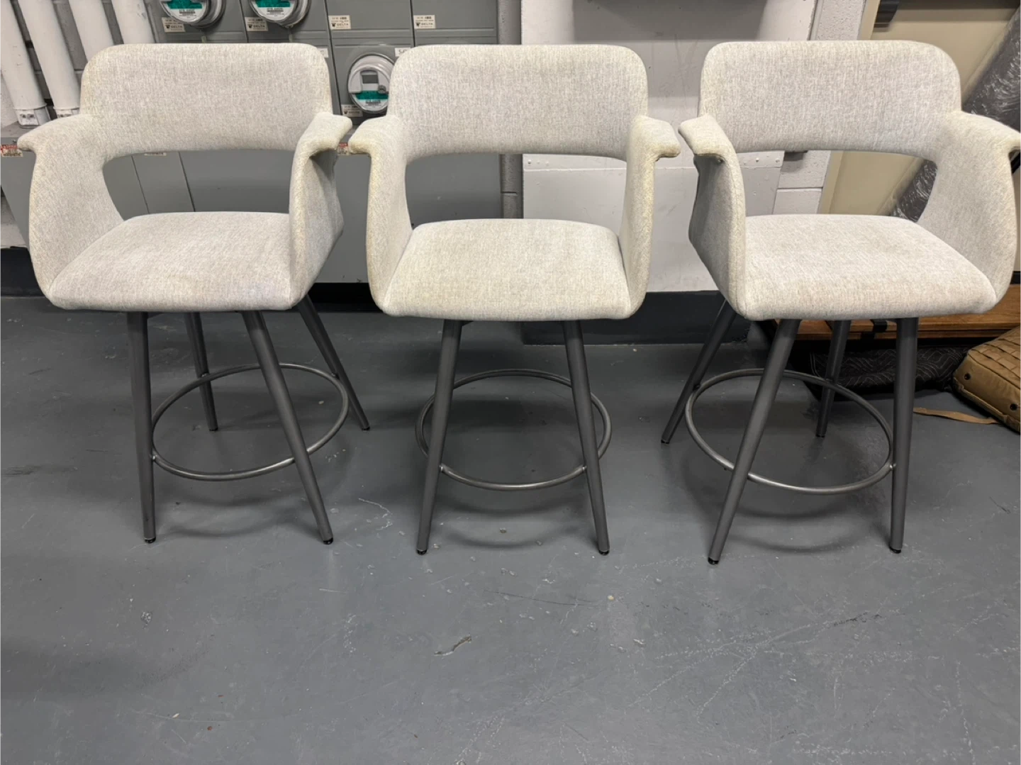 Selling a set of Amisco Sorrento swivel bar stools. They feature a light gray fabric and metal legs. There are some signs of wear on the arm rests of the stools. One retails for $900 selling all 3 for $800