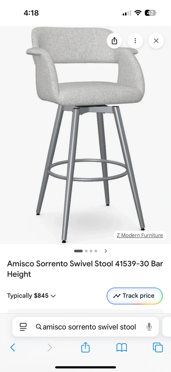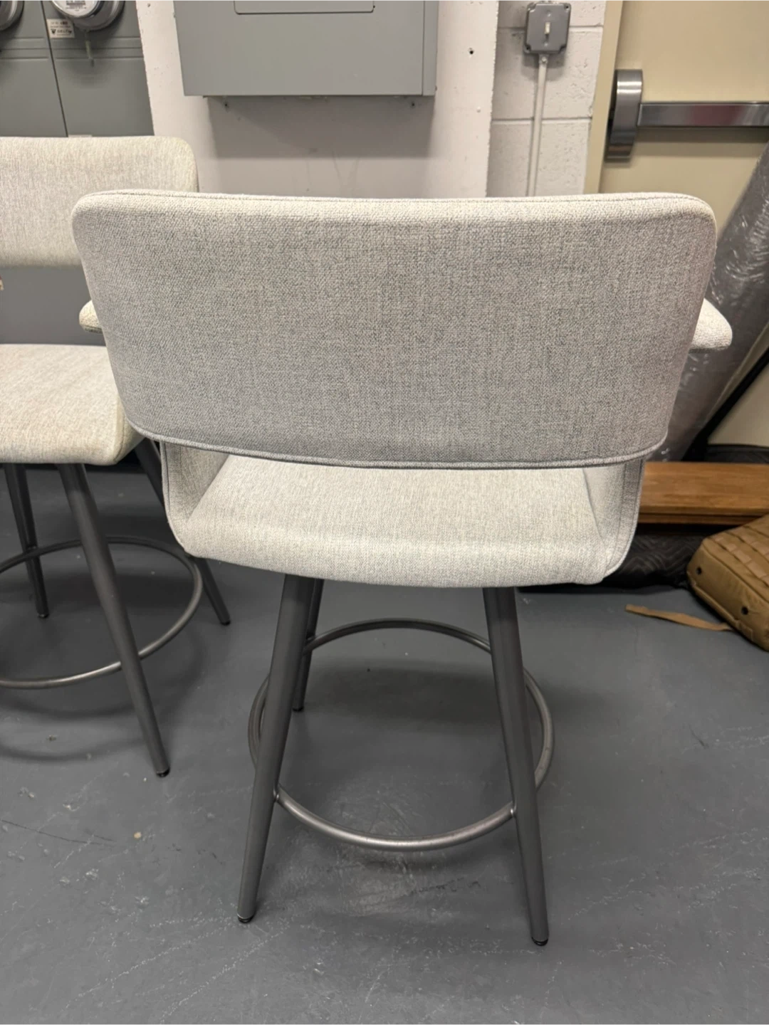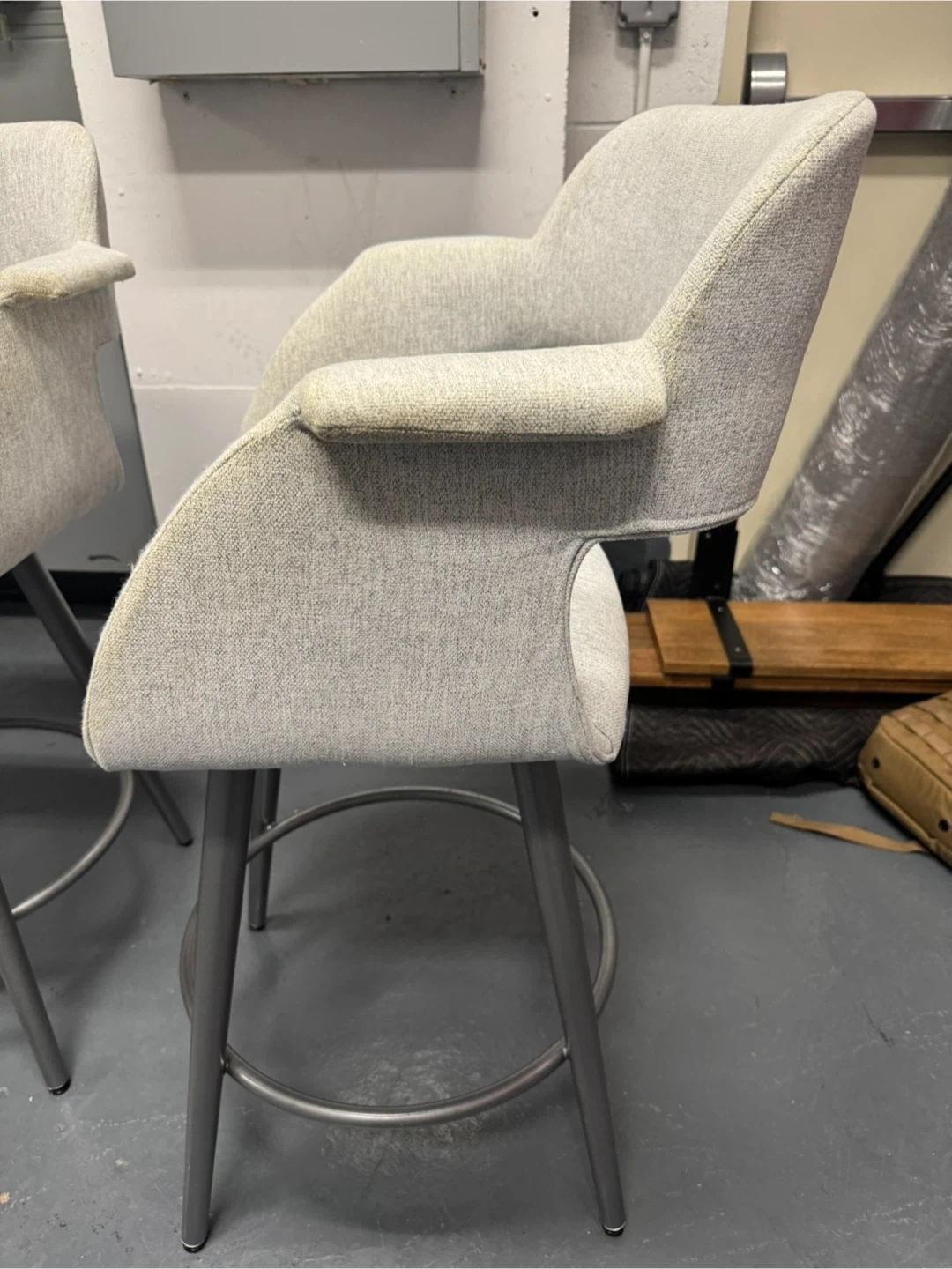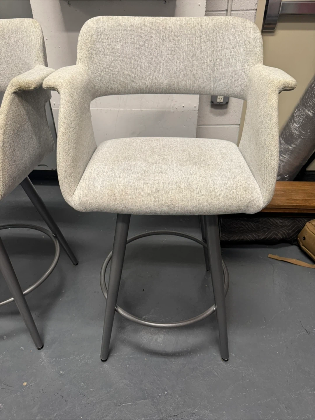 Selling a set of Amisco Sorrento swivel bar stools. They feature a light gray fabric and metal legs. There are some signs of wear on the arm rests of the stools. One retails for $900 selling all 3 for $800
