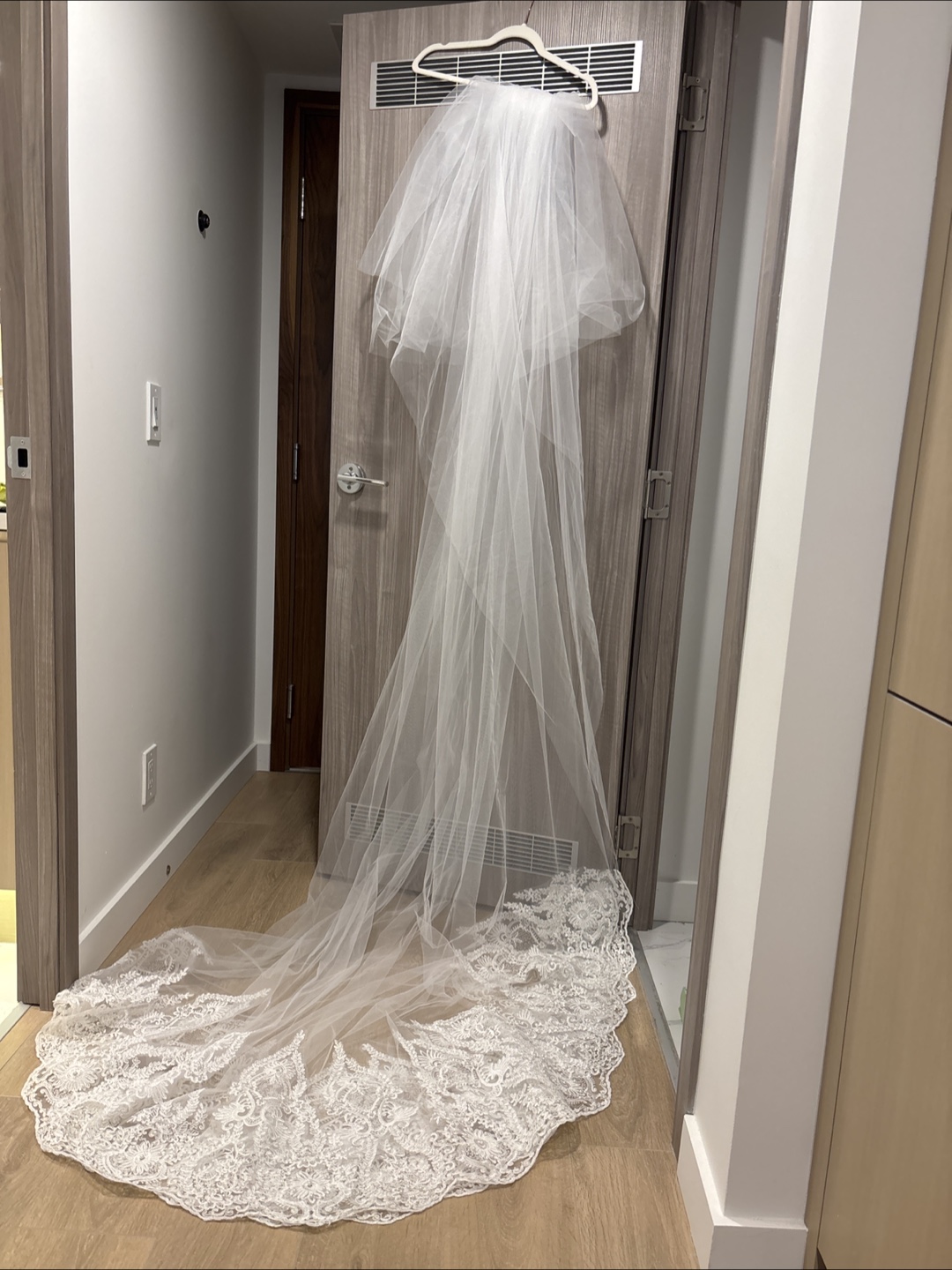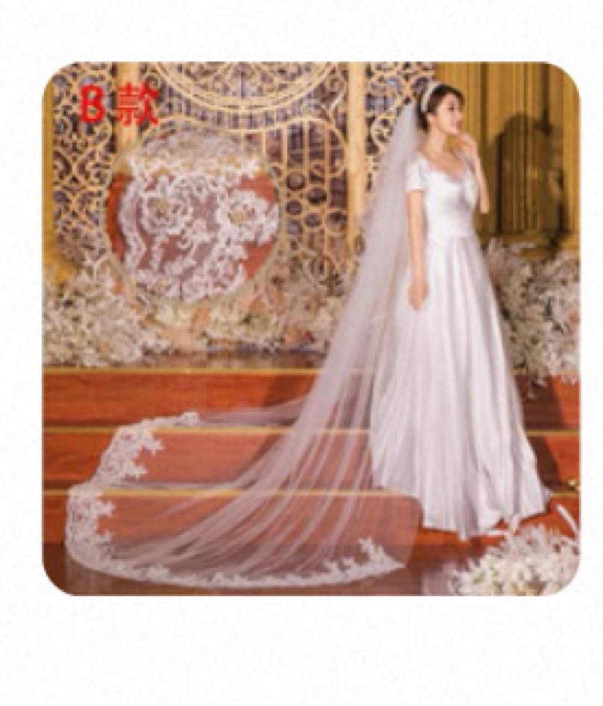 A wedding veil. 3 meter long style. Features a delicate lace trim. The lace details add a touch of elegance. You can imagine yourself floating down the aisle, wearing it.