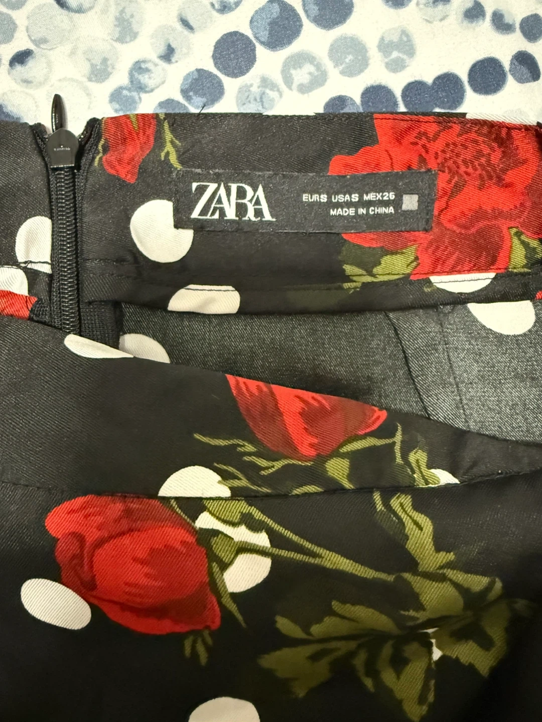 Selling a Zara skirt in excellent condition! It features a black background with a red floral and white polka dot pattern. Cute little ruffled slit in the front. Perfect for adding a pop of colour to your wardrobe!