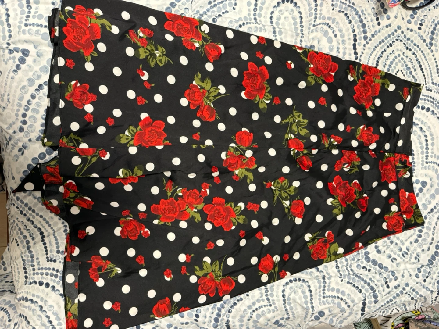 Selling a Zara skirt in excellent condition! It features a black background with a red floral and white polka dot pattern. Cute little ruffled slit in the front. Perfect for adding a pop of colour to your wardrobe!