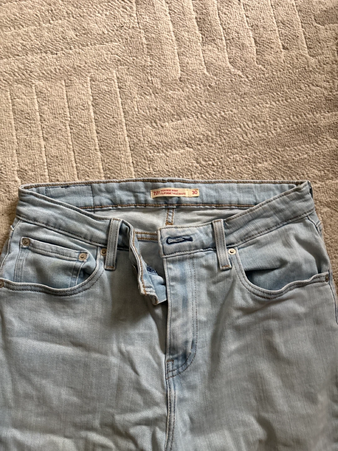 Selling a pair of Levi's 721 High Rise Skinny jeans in size 30. They're a light wash and in good condition. Perfect for everyday wear!