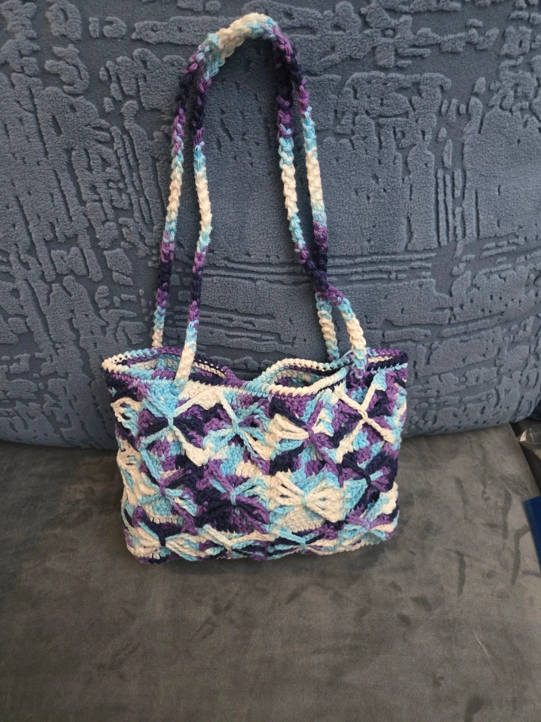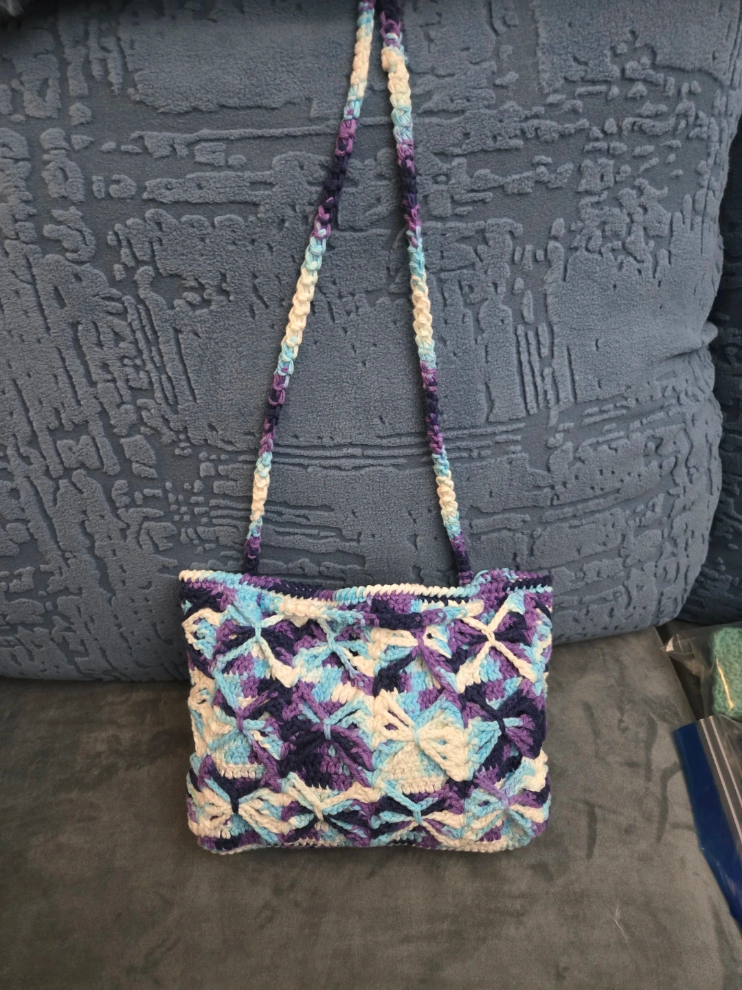handmade crochet purse in a beautiful white, dark blue, light blue and purple colour. Has a diamond pattern throughout. The braided straps are sturdy, comfortable and allow the purse to be worn as a crossbody/shoulder purse or a handbag