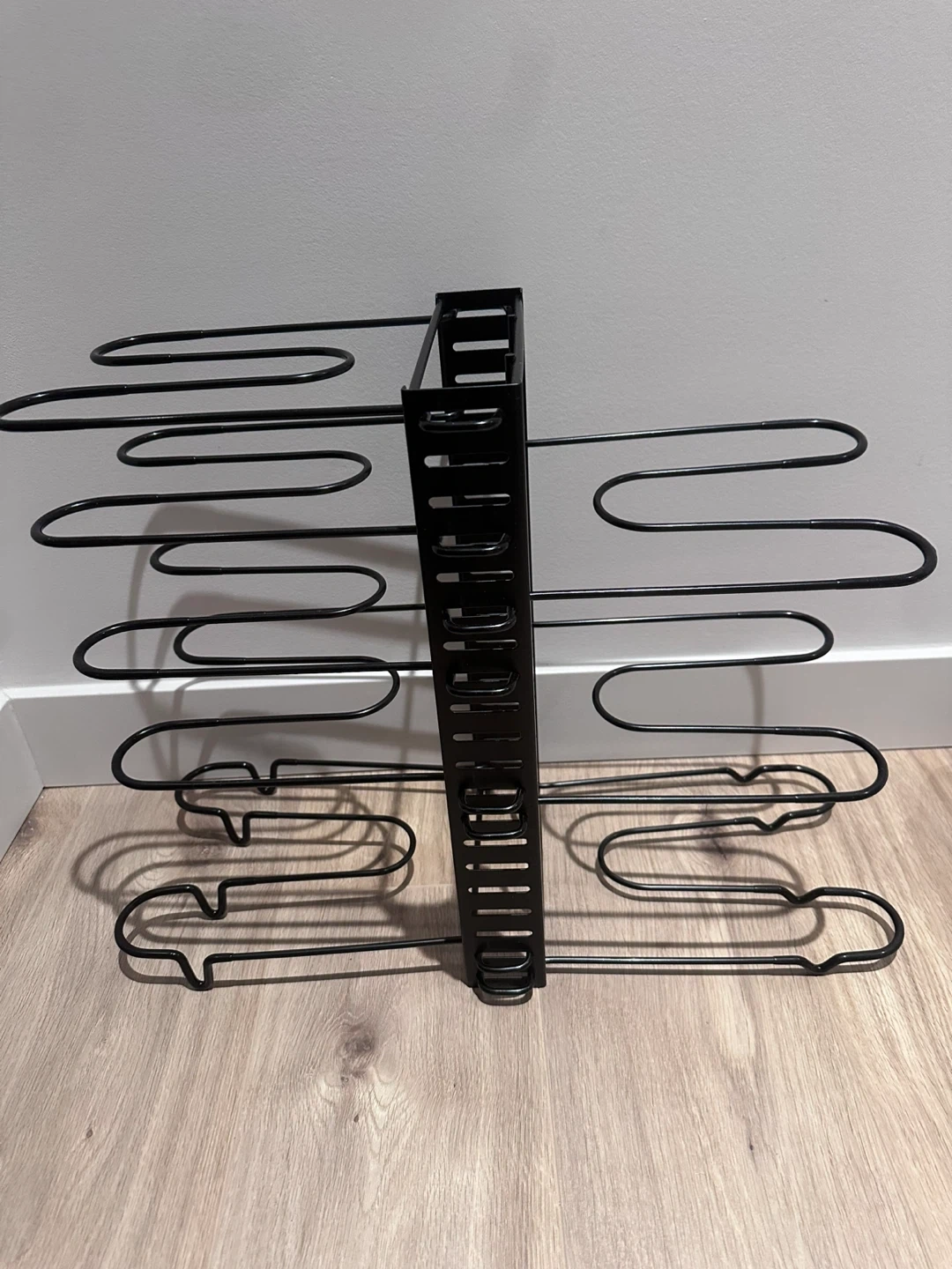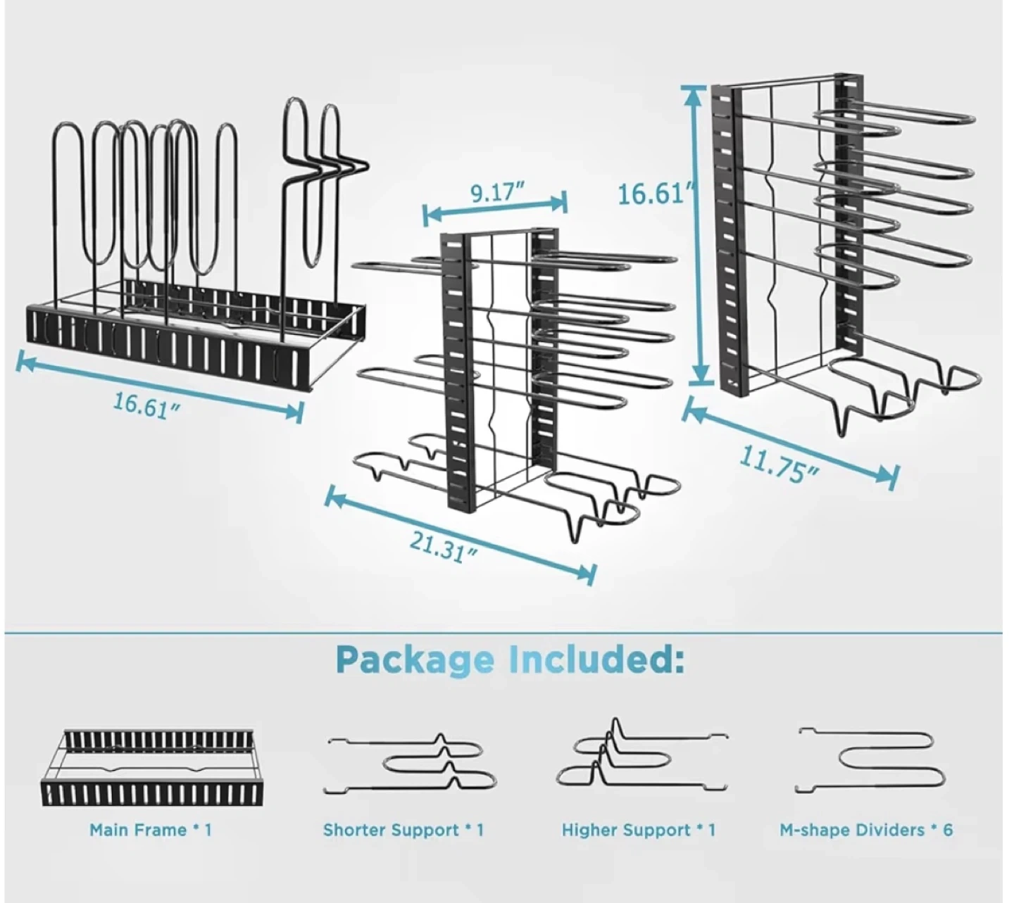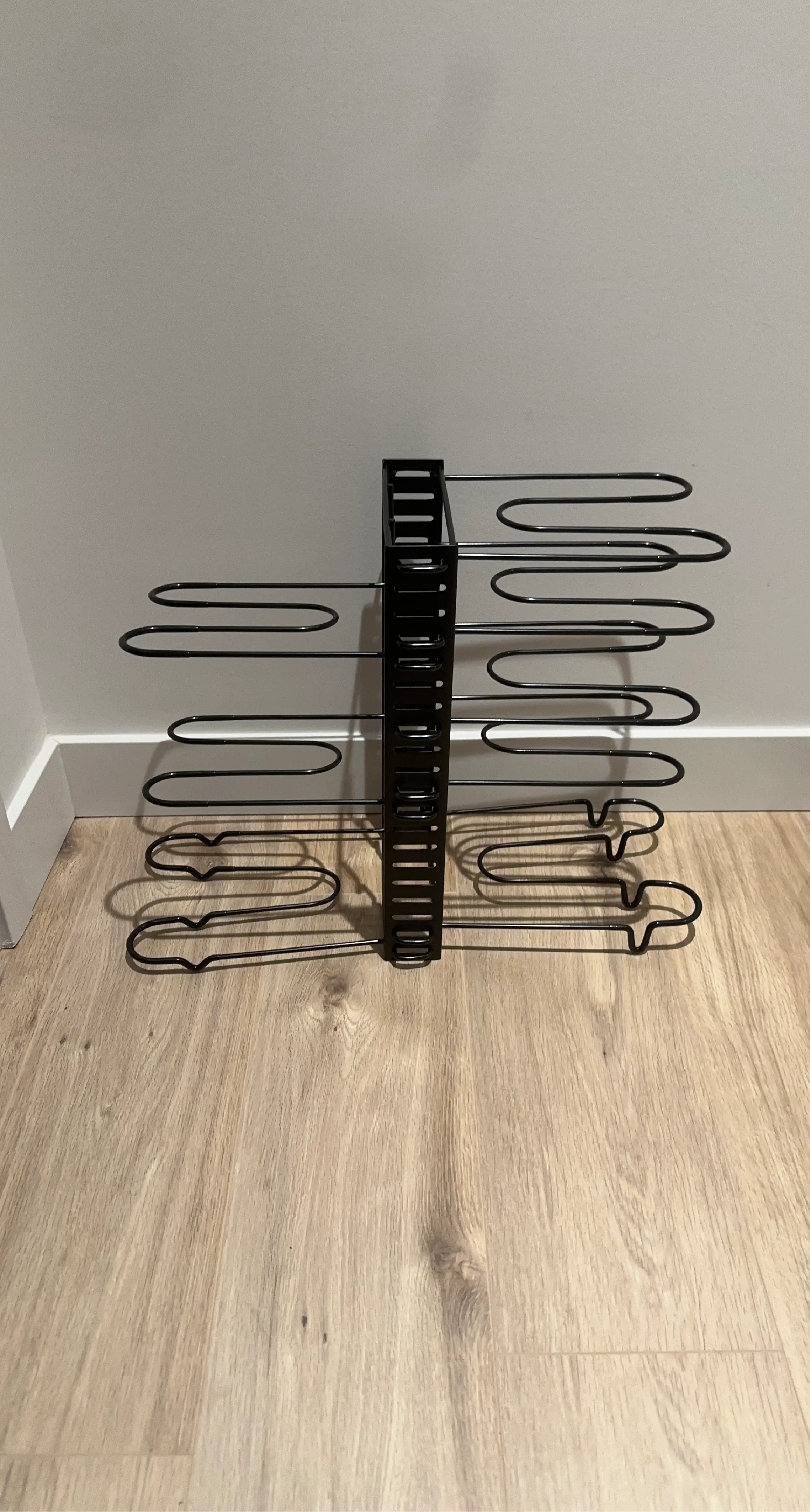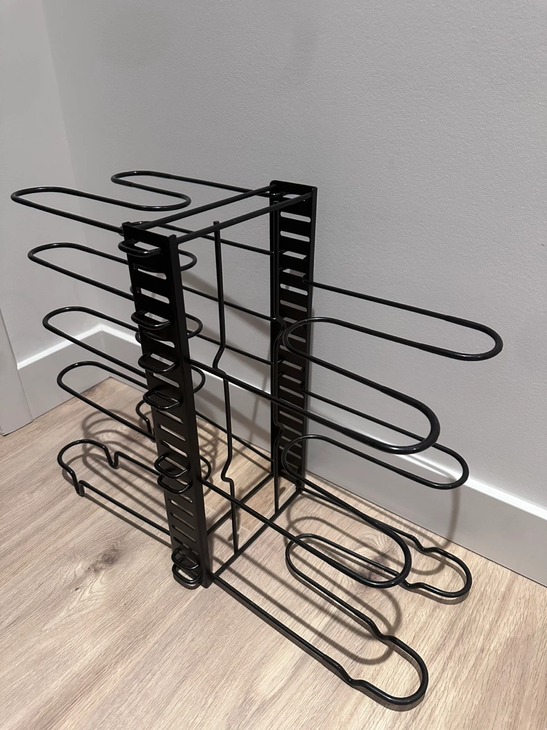 This organizer rack is designed to store pots, pans, and lids neatly in your kitchen. It's made of sturdy black metal and has multiple adjustable tiers. Keep your cookware organized and accessible!