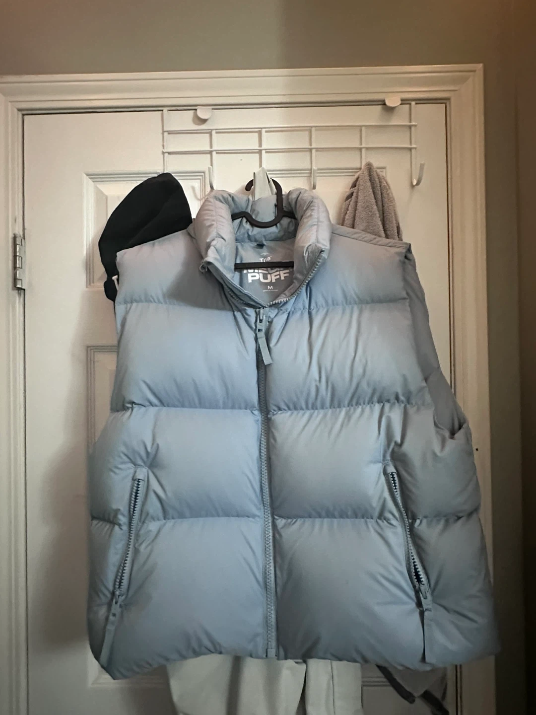 A light blue puffer vest from Top Puff. It's a size medium with zipped pockets. This vest is great for layering on cooler days!
