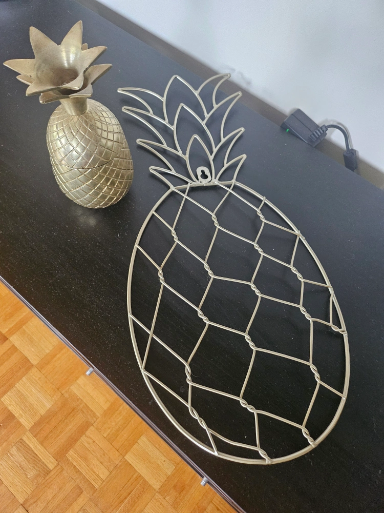 Selling some pineapple decor! One is a metal wire wall hanging geeat for attaching photos and the other is a metal decorative pineapple with lid and storage, both in good condition
