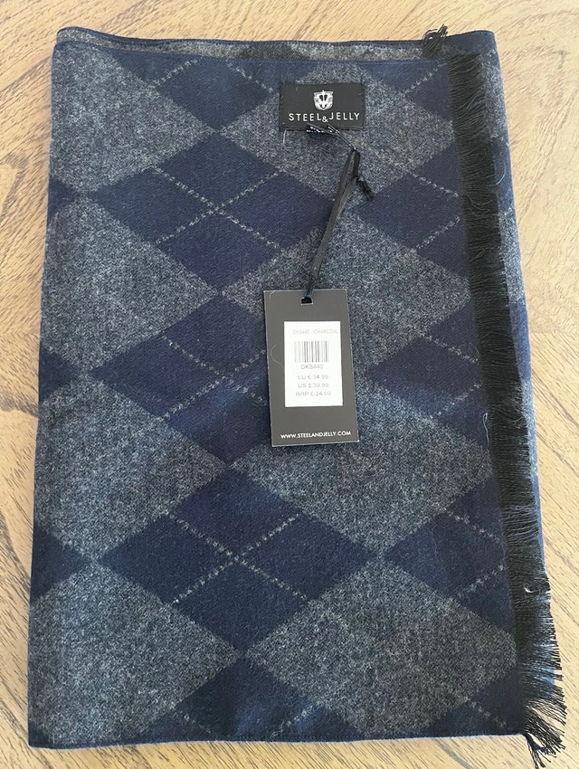 Wrap yourself in luxury with this Steel & Jelly scarf, showcasing a stylish navy and grey argyle pattern, perfect for adding a touch of sophistication to any outfit. This scarf is new with tags, ensuring its pristine condition. Brand: Steel & Jelly, Pattern: Argyle, Colours: Navy and Grey, Condition: New with tags. Cash accepted.